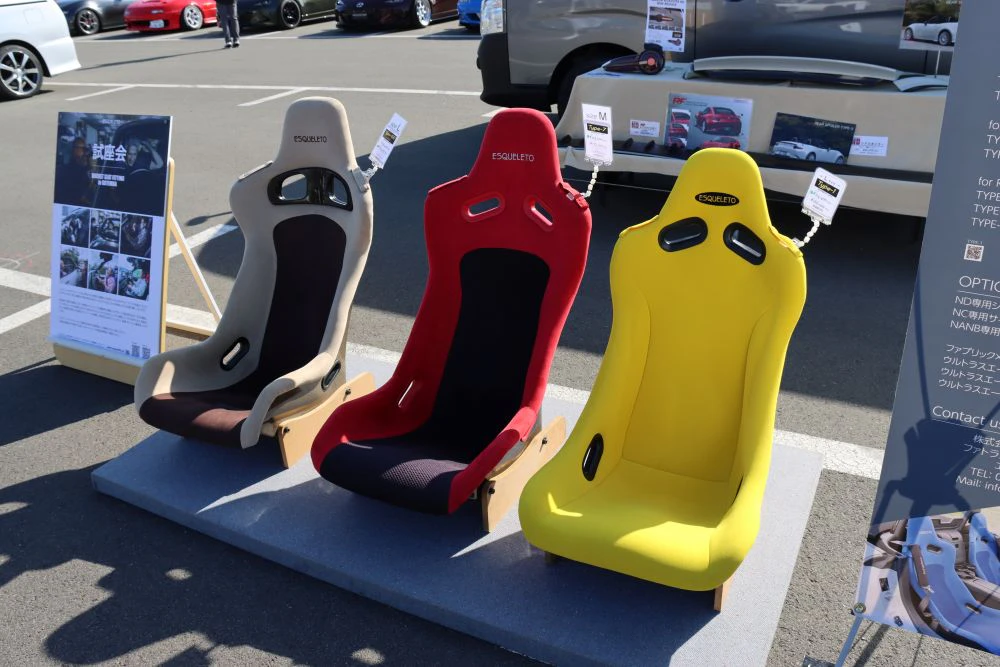 ESQUELETOのフルバケットシートを展示。特にND型は純正シートにスピーカーが内蔵、シート交換時にナビ音声などの機能が失われるが、この専用移設キットにより、純正スピーカーが移設可能な点を強調