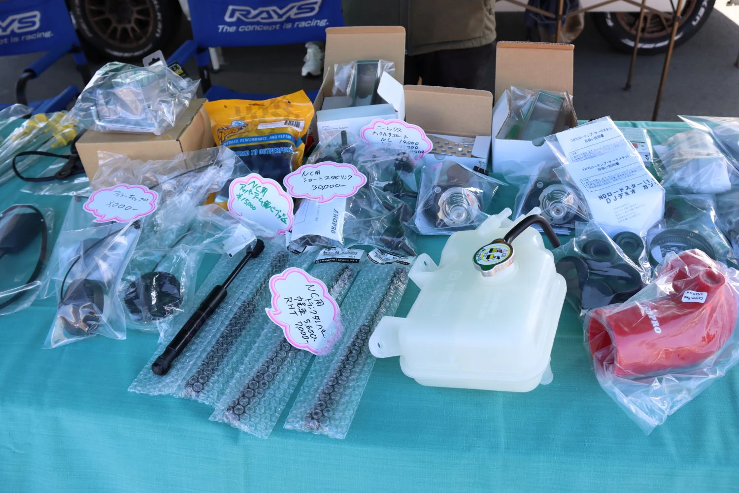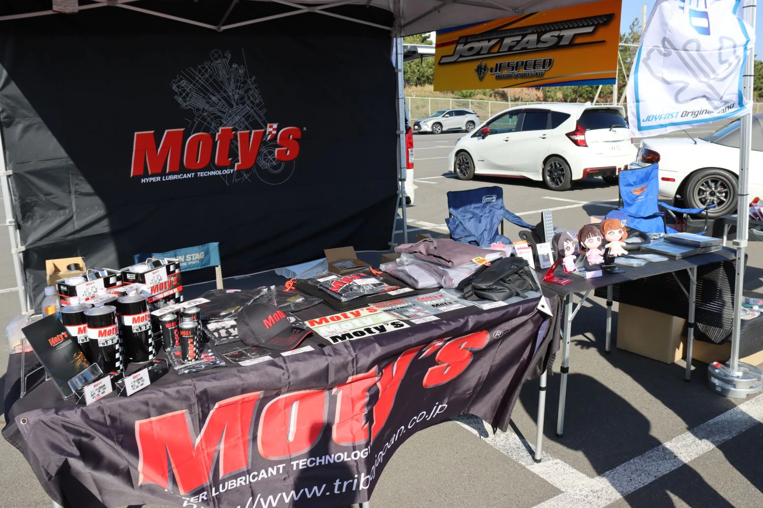 Moty'sのレーシングオイル、3wayサスペンションなどを展示。ロードスター乗りは、走りよりも街乗りを重視する層が多いため、サスを適度にロールさせ、乗り心地が良い製品を中心にアピールした