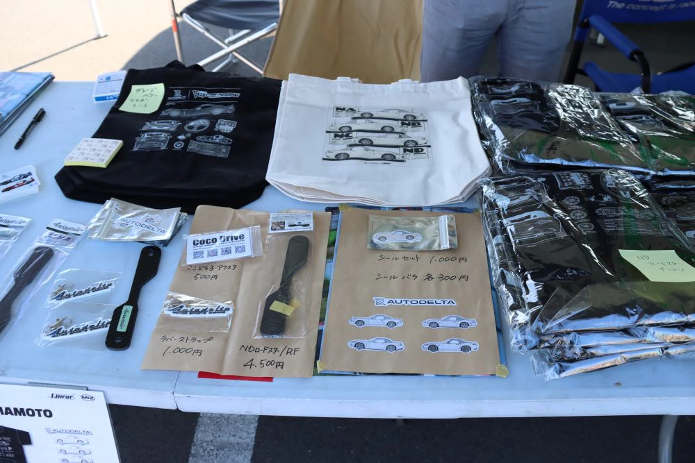 オリジナルデザインのアパレル商品を主に展示。特にロードスターの三面図をモチーフにしたTシャツやトートバッグが目を引く。マツダのライセンスを取得し、本格的な商品展開が可能になっていた