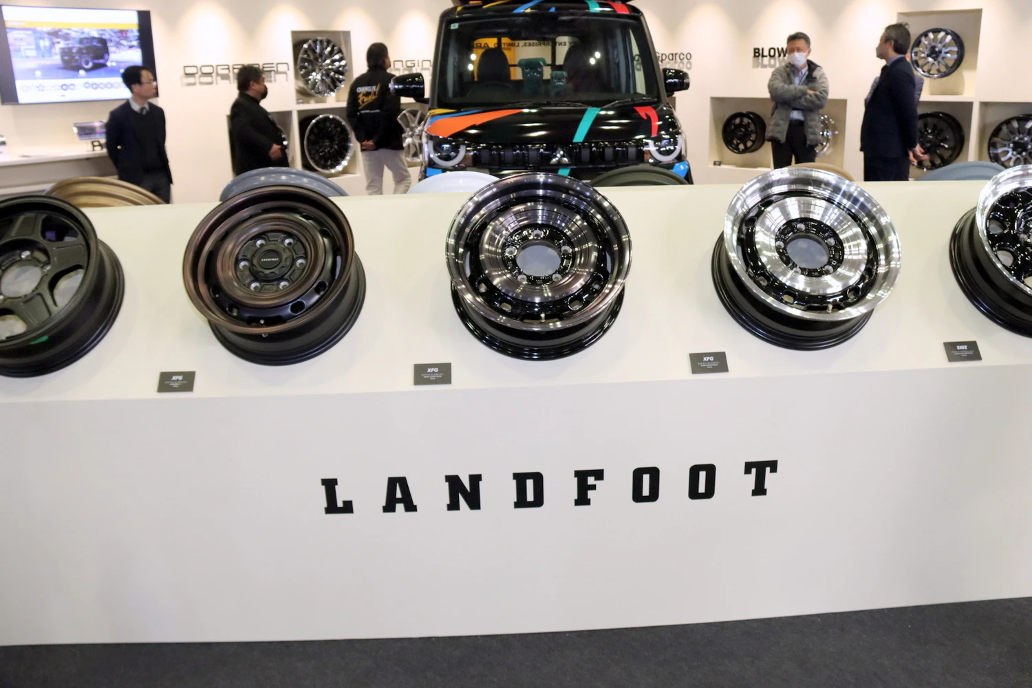 売れ筋の鉄チン風ホイール「LANDFOOT」を中心にアピール。まるでアパレルショップのショールームの様なオシャレなブース内に、愛車にこのホイールを履かせるとどうなるかといったシミュレーションディスプレイも用意され、服を買うのと同じように、手軽にホイールを変える流れを訴求した。