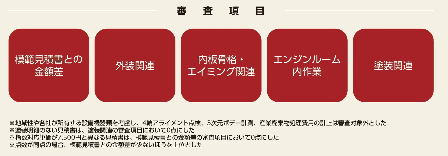 審査項目は大きく分けて5つ。模範見積書との金額差、外装関連、内板骨格・エイミング関連、エンジンルーム内作業、塗装関連に分け、計上の有無などいくつかの基準を設けて100点満点で採点した。なお、詳細な審査基準ならびに配点については公表していない。