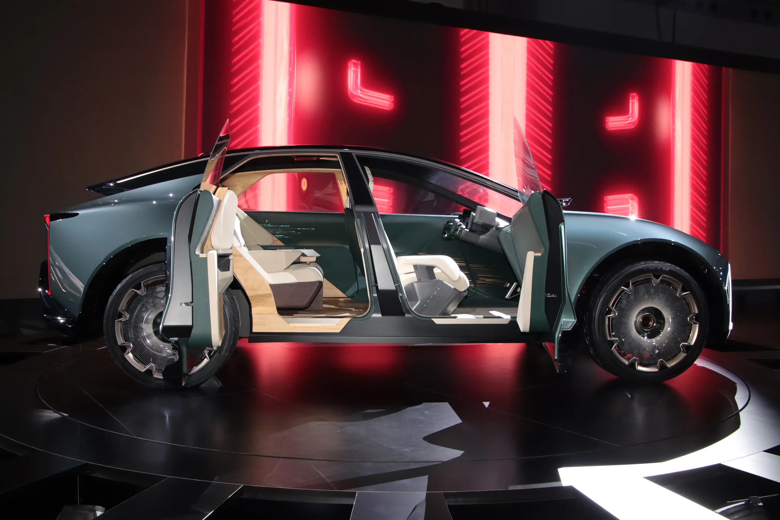 右側はフロントのみ通常のスイングドア、左側は前後にスライドドアを備える左右非対称ボディとした同車は、室内右側に運転席と、秘書用の補助席を前後に、左側にはVIP用助手席のみを後方に装着する2+1シートを採用。
