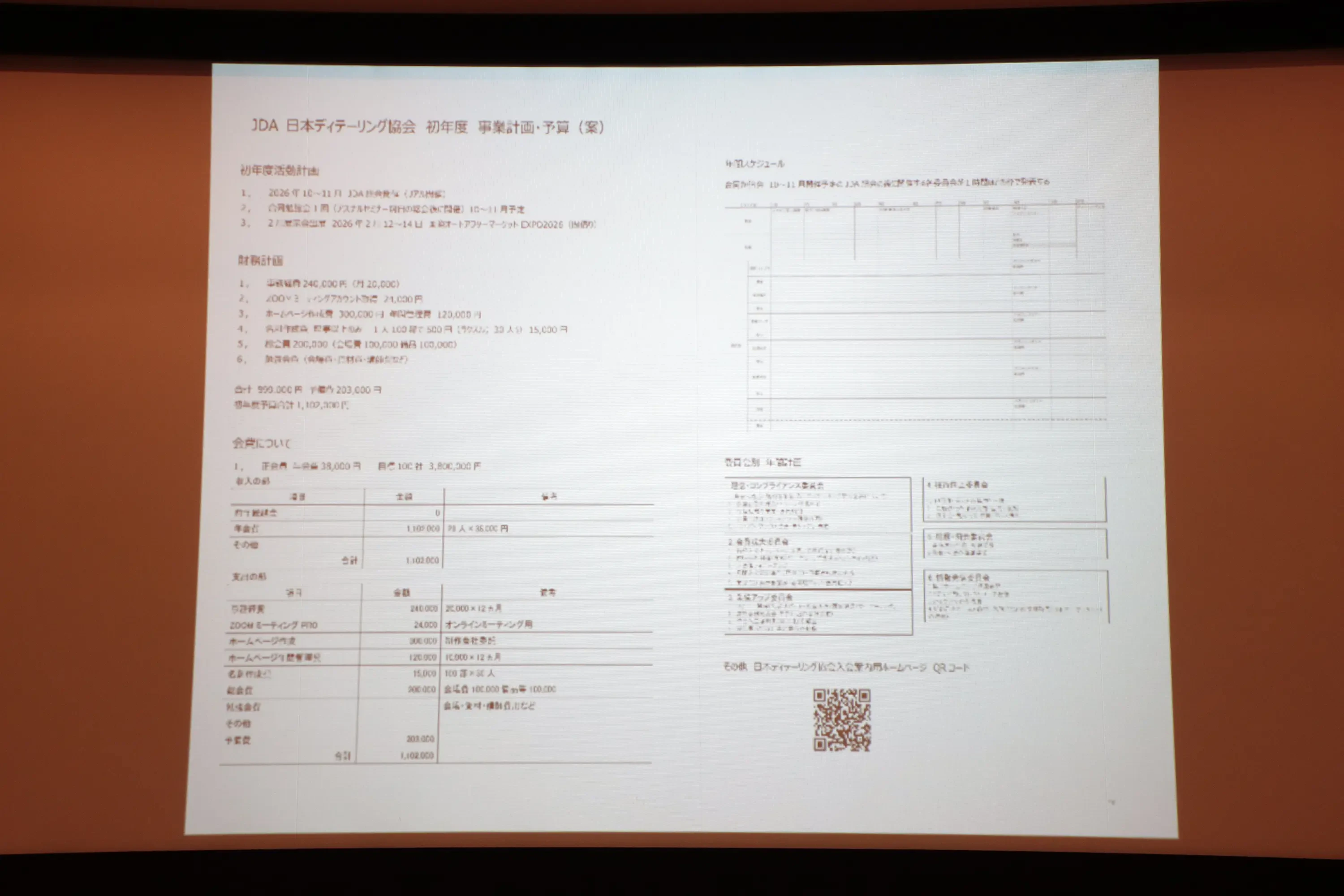 設立総会閉会後の質疑応答で、特にすべき事業内容について、丸山会長は「JDAは理事・役員合わせて30社で発足したが、将来的にはこれを300社規模にしたい。また、JDAを国に認められるような団体にしたい」と、JDAをカーディテーリング業界と行政との橋渡しを担う団体へ成長させるビジョンを示唆。