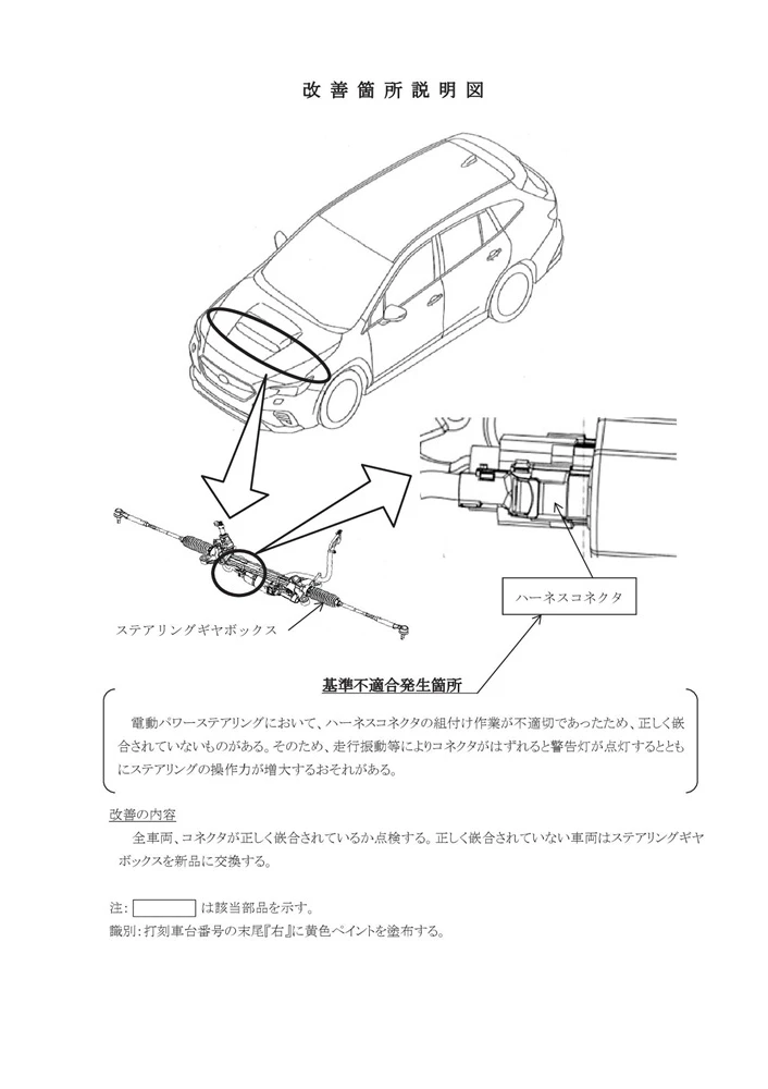 改善措置として、全車両のコネクタの嵌合状態を点検する 。不備が確認された車両については、ステアリングギヤボックスを新品に交換する対応をとる 。