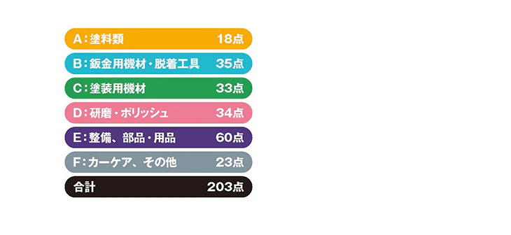 2025年に掲載された新製品203点を、「塗料類」、「鈑金用機材・脱着工具」、「塗装用機材」、「研磨・ポリッシュ」、「整備、部品・用品」、「カーケア、その他」の6ジャンルに分類。読者には分野別に「関心を持った製品」と「実際に購入した製品」を、オートサプライヤーには「関心を持った製品」と「よく売れたと思う製品」を上限5点まで選んでもらい、集計した。