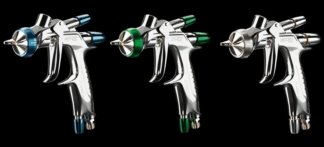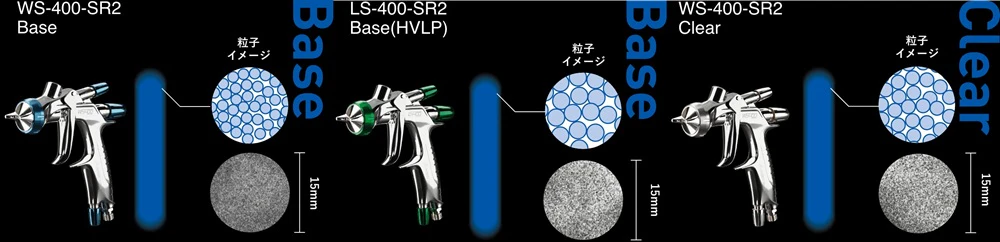 写真は、左からWS-400-SR2 Base、WS-400-SR2 Base HVLP(ETとETSがあり、ETSは中央が膜厚でウェット塗装が得意)、WS-400-SR2 Clear