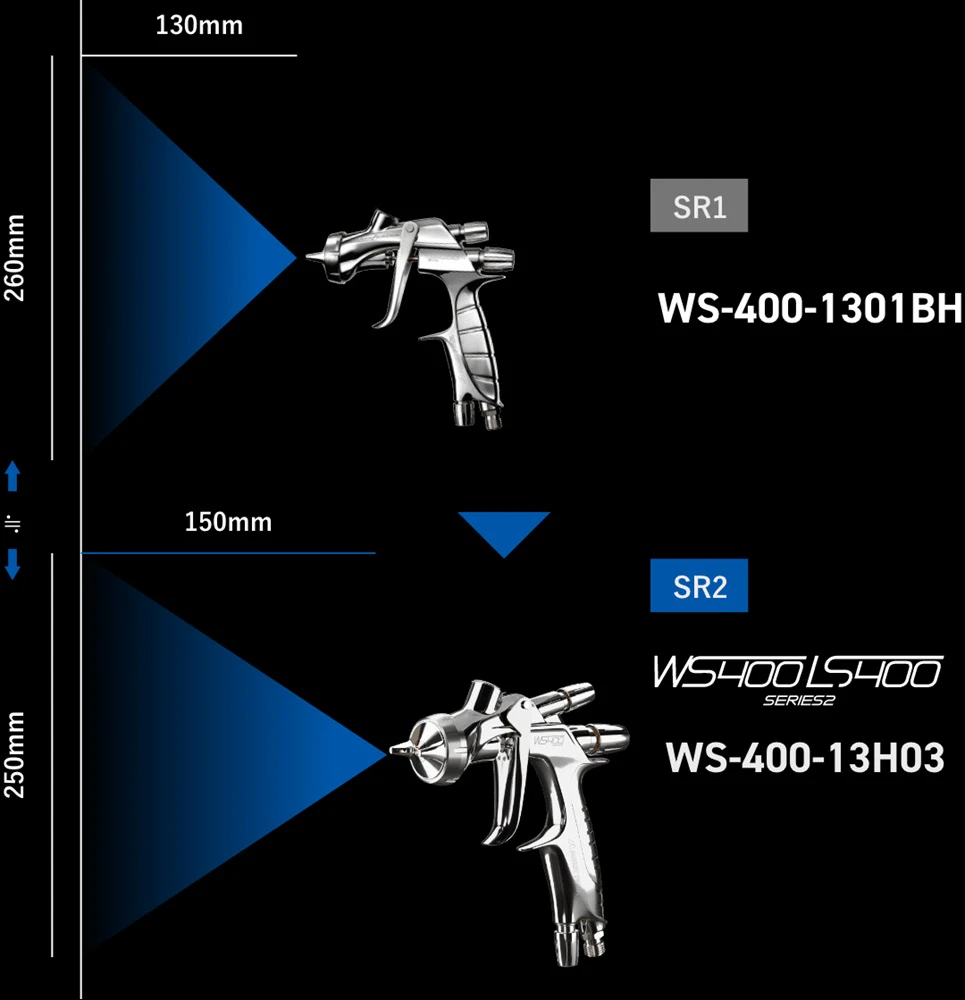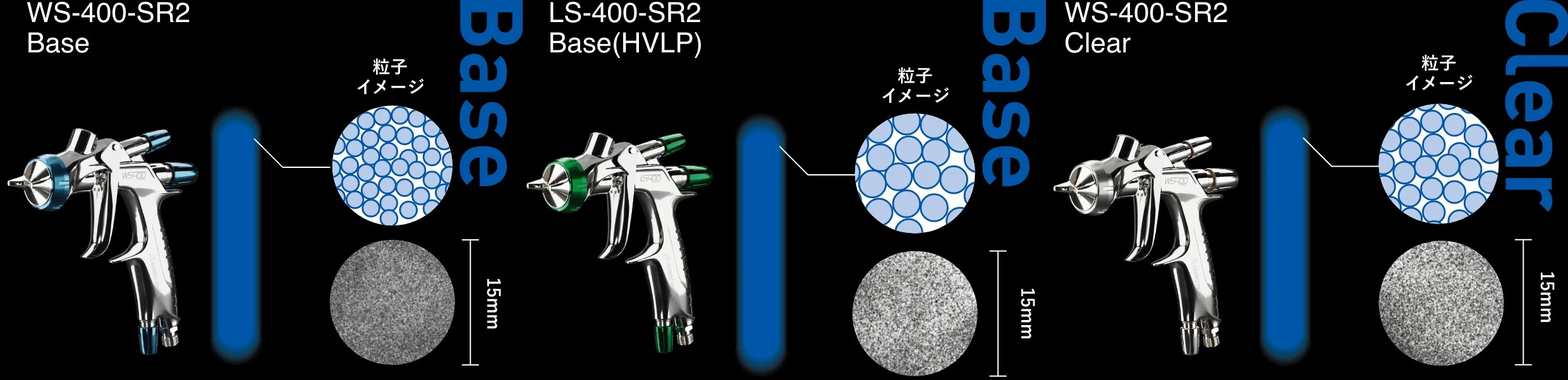 - SR2 Base HVLP: 塗装環境や塗料メーカーのコンセプトの違いに対応。特にブース内が低湿な環境下でも、最適な粒子径で安定した仕上がりを実現。