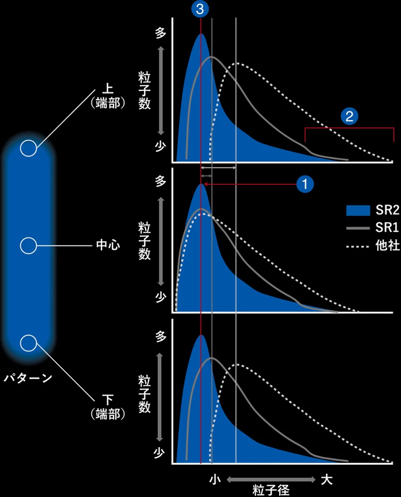 「形だけ」のフラットパターンの場合、粒子分布が中央に寄り、まるで「人の眼」のように中心部だけが厚くなる傾向がある。しかしSR2は、パターンの上端から下端まで粒子径と粒子数を同等に配置。 粗すぎる粒子や細かすぎる粒子を極限まで排除し、高密度かつ均一に並べることで、重なり部分のスジムラを低減。パターンの「際」までスピット(大きな塗滴)が少ないため、ボカシ際も美しく馴染み、ウェットコントロールを容易にしている。