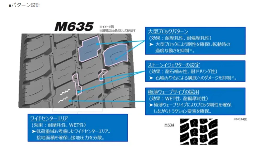 「DELVEX M635」の開発では、同社独自のトラック・バス用タイヤ開発基盤技術「e-balance(イー・バランス)」を活用。大型ブロックパターン設計及びワイドスチールベルト構造によってトレッド部の剛性を確保し、走行時に生じやすい過度なブロック変形を抑制した。さらに、積載量が少ない状態での走行シーンも想定に入れ、トレッド面中央部にワイドセンターエリアを設けることで接地状態を安定させている。低荷重時にも摩耗が偏りにくい構造とすることで、摩耗ライフを14%向上(当社従来品M634比)させるとともに、ブロック表面に生じる段差状の摩耗を40%低減している。
