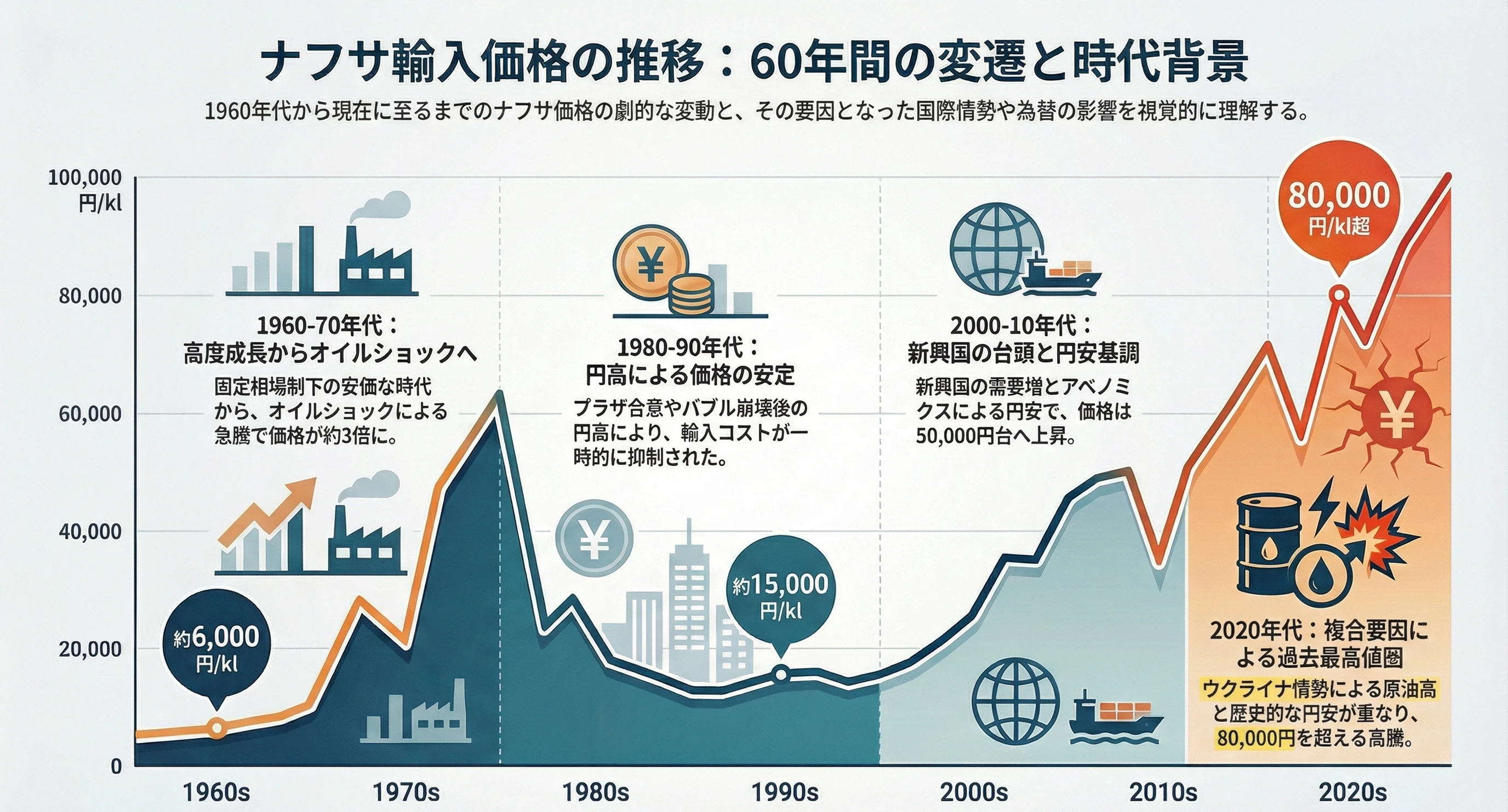 ここでナフサ輸入価格(国産基準価格)が歴史的にどのように変動してきたのか、1960年から現在までの推移をグラフで見てみたい。
