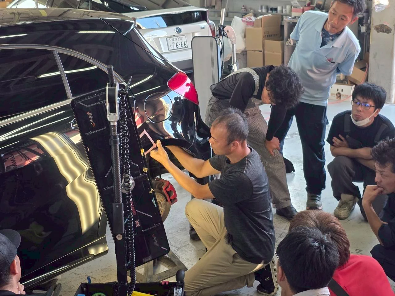 デントリペアをテーマに、どのような作業で復元をするのか、損傷状態による作業の難易度はどの程度なのかなど、実車を用いて各部位のデントリペアを実演しながら説明した。講師はデントラボユウイチ・高畑氏。参加者は40人。