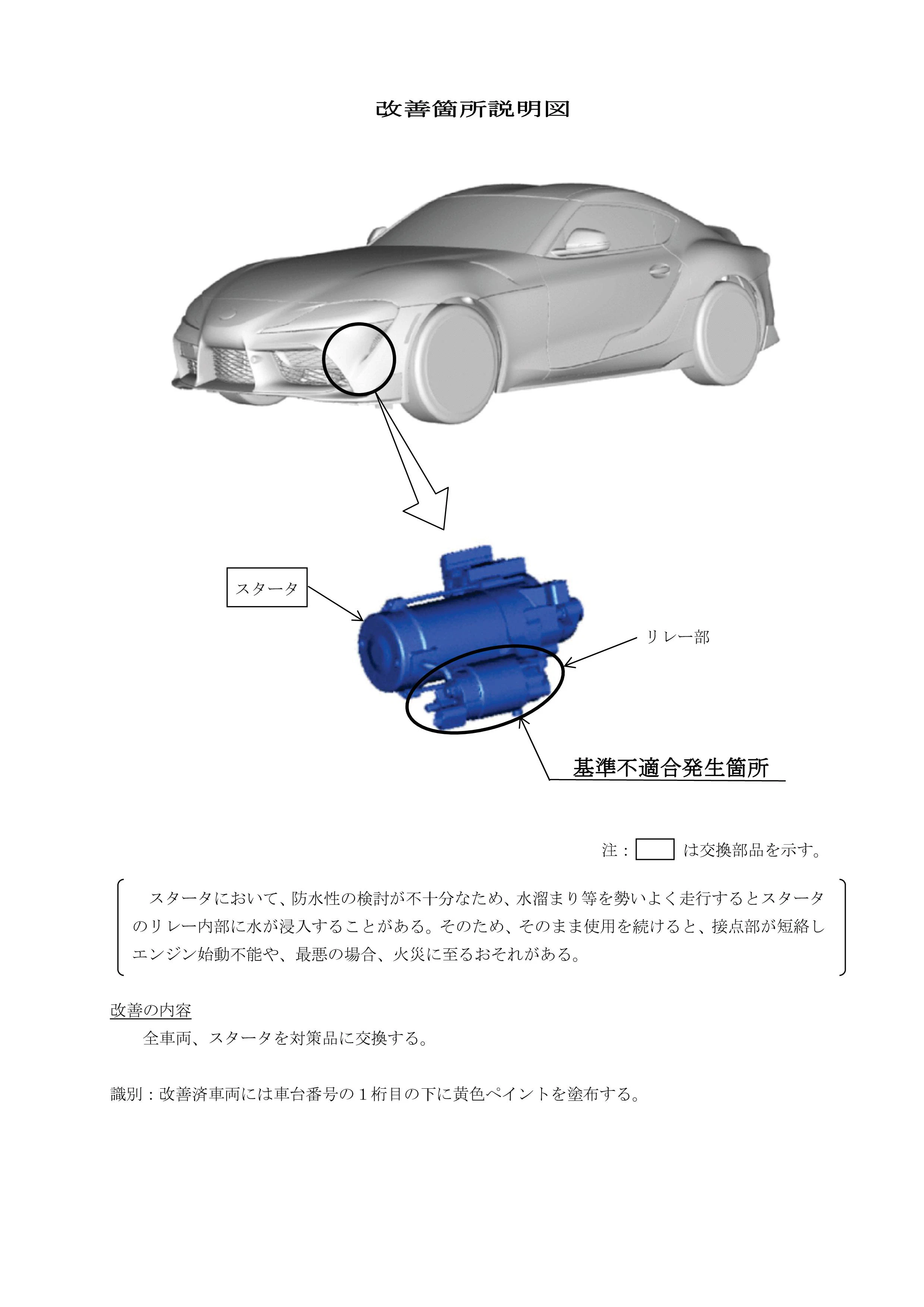 トヨタは、対象となる全車両に対し、スタータを対策品に交換する改善措置を実施する 。