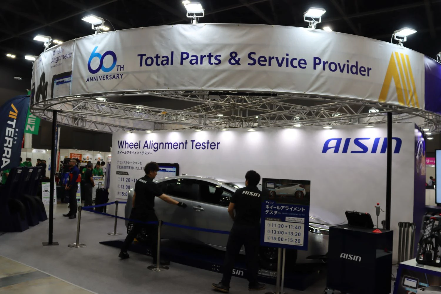 創立60周年をブースデザインに反映。ホイールアラ イメントテスターのデモンストレーションや新ブラ ンドAITERAのタイヤなどを披露