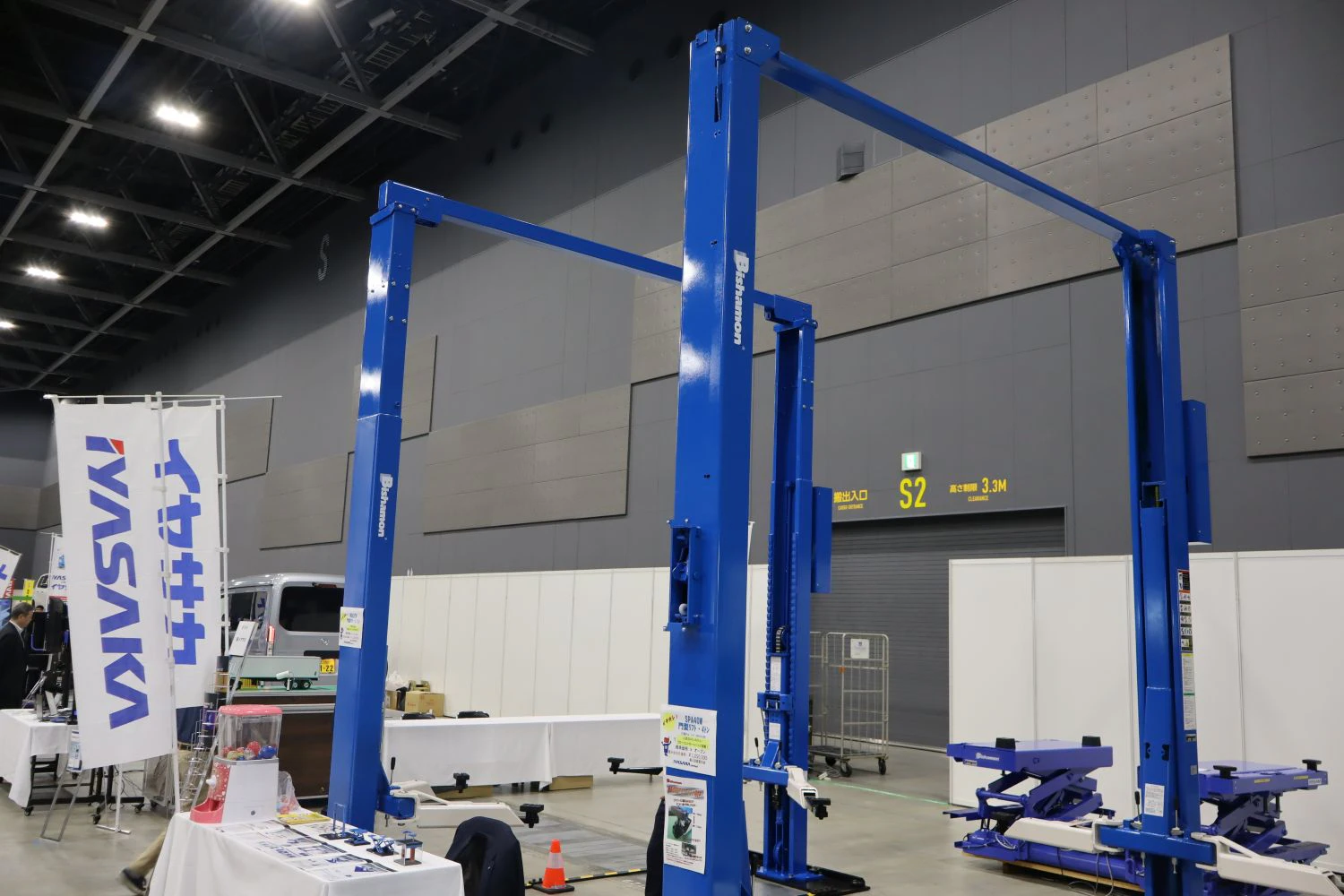 フローコントロールバブル搭載の「SPA40W門型リ フト・4トン」をはじめ、スキャンツール、車検関係 機器、ボデー修正装置、アライメント機器など各種 主力製品を展示