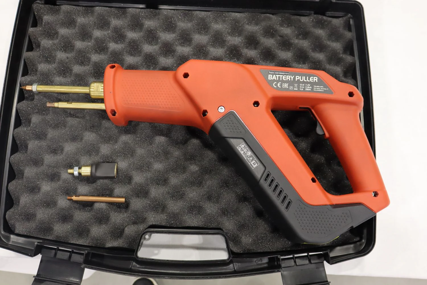 現 場 の 技 術 者 に や さ し い、 コ ー ド レ ス で 軽 量 な 「BATTERY PULLER」を展示。ワッシャ溶接用の各 種オプション商品も紹介した