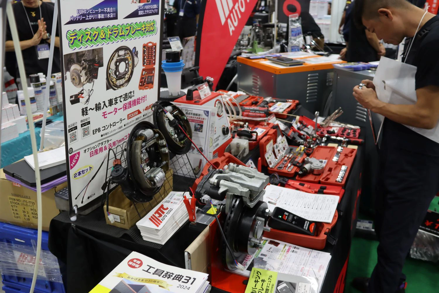 電動パーキングブレーキパッドに使用できる「EPB コントローラー JTC6350」や潤滑スプレー「WD- 40」など各種人気製品を展示