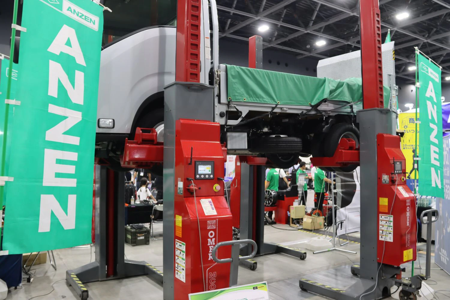 トラックやバスの足回り整備時に役立つ、大型車用 移動式「モバイルコラムリフト MC086」を実演展示。 各コラムは無線通信でつながっている