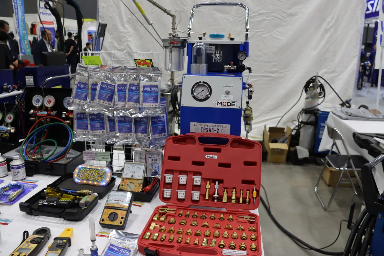 エアコンサイクル内の故障発生原因物質を除去でき る 洗 浄 マ シ ン「 エ ア コ ン サ イ ク ル 洗 浄 マ シ ン TPSAC-2」をメインに展示。その他、オプション商 品を紹介
