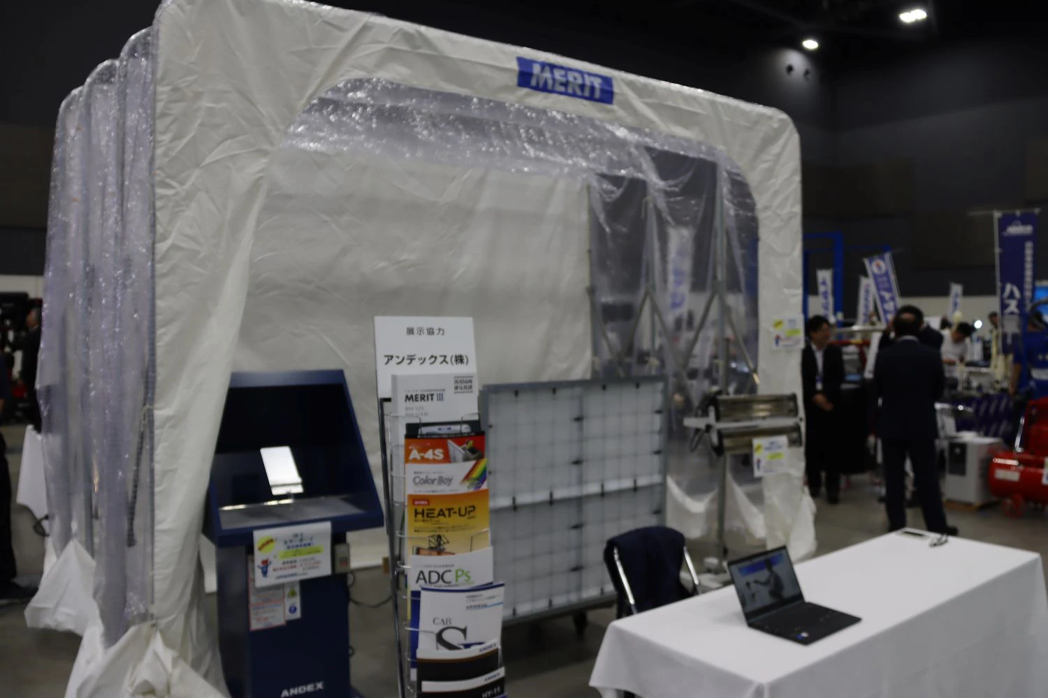 アコーディオン式汎用局所排気装置「MERITIII」や、 シロッコファン搭載の調色用スプレーキャビン 「Color Boy」を展示