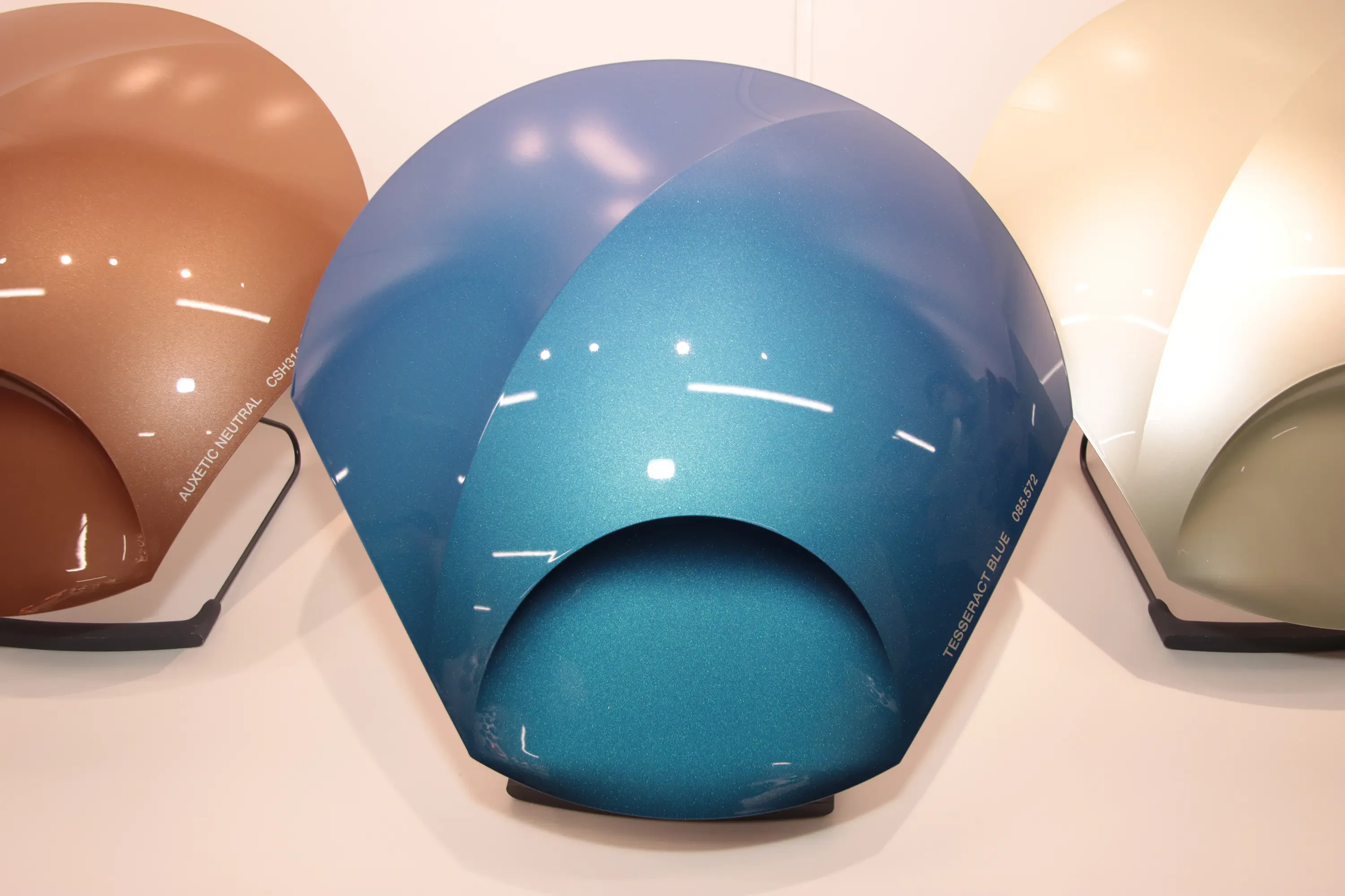 鮮やかなブルーではあるが、補色の関係ではない色へカラーシフトできる先進的な干渉顔料を用い、グリーンやパープルのハイライトがほのかに見えるように色が変化する。昨今の政情不安や気候変動から見えてくる、自分たちに何が足りないのか、何があれば前へ進めるのかを明らかにし認識して、新しい視点で解決策を考えるという、多次元的な見方を色に翻訳した。