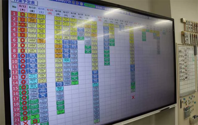 目を引く巨大スクリーン、顧客の名前と、電話やWebで予約を受けた作業が一目瞭然となっている