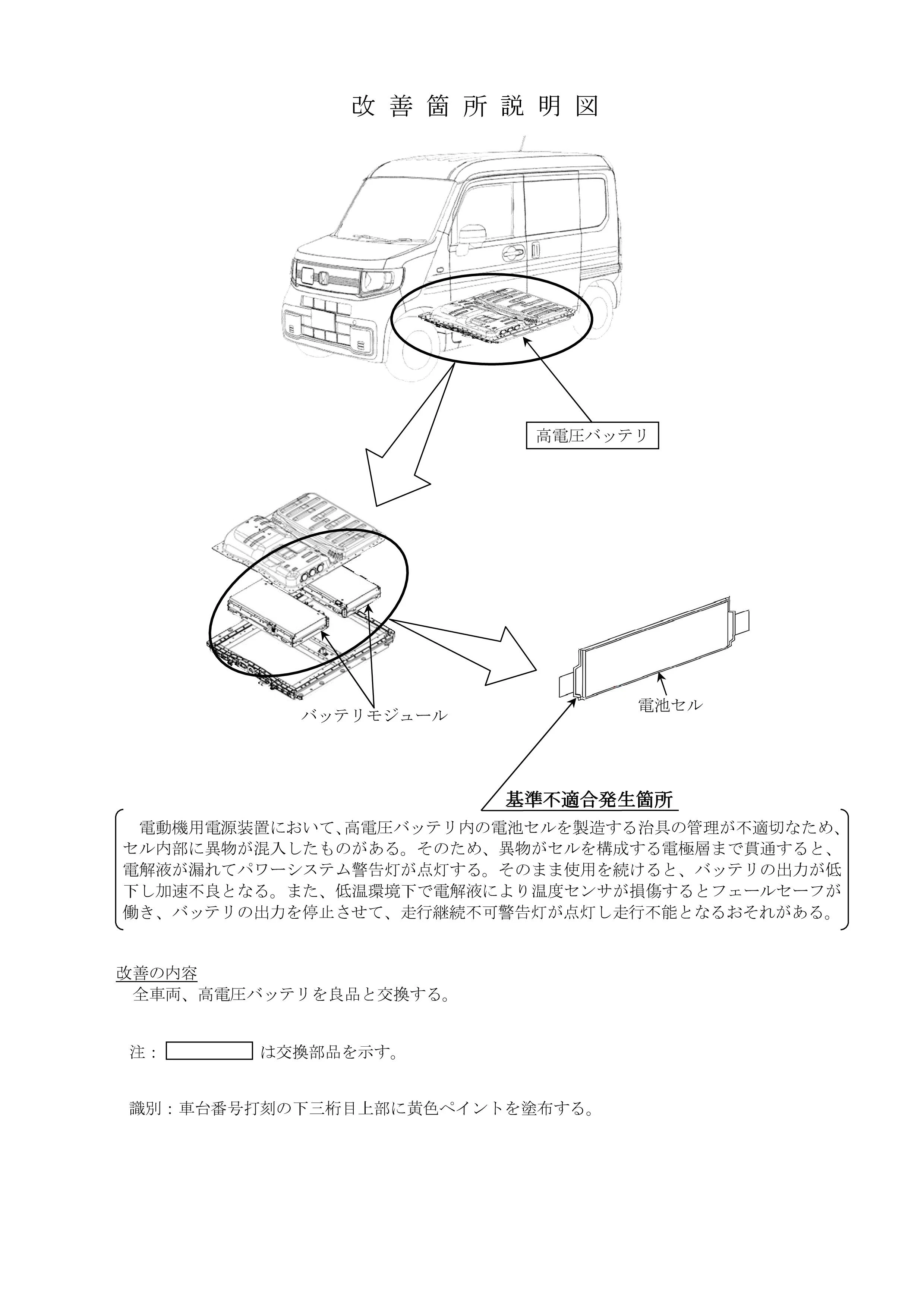 不具合は電動機用電源装置内の高電圧バッテリにあり、電池セルを製造する際の治具(工具や器具)の管理が不適切なため、セル内部に異物が混入したものがある。