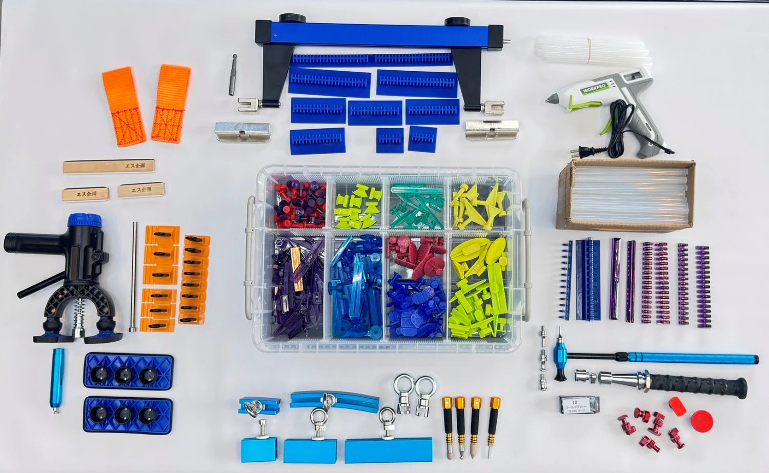 グルーガンやリフター、各種タブ、ハンマーなど、鈑金とデントリペアの両方に知見のある同社がセレクトした接着引き出し鈑金のためのプリングツール27種類のセット。