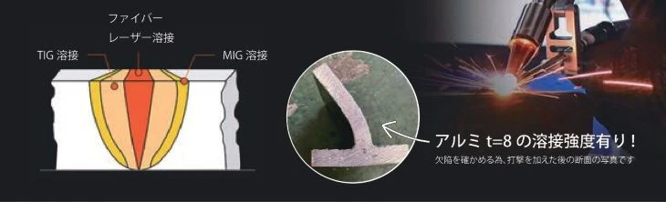 レーザー溶接は、従来の溶接技術と比べ、素材へのエネルギー吸収が優れており、局所的に熱が入ることで溶け込みが深く、歪みを抑え、アルミなどの高い反射素材の世節が安易に行えるのが特徴となっている。