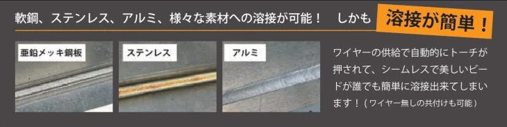 基本機能の溶接も充実。軟鋼、ステンレス、アルミニウムなど多様な素材への溶接が可能。ワイヤーの供給により自動的にトーチが押され、シームレスで美しいビードを誰でも簡単に形成できる。ワイヤーを使用しない共付けも可能