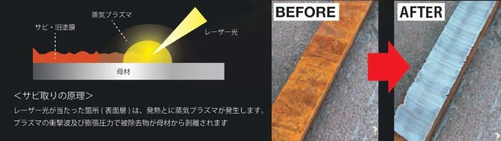レーザー「洗浄」システム(錆取り)は、光を使用して錆や塗料を瞬時に除去するハイテク技術。レーザー光が当たった個所(表面層)は、発熱とともに上記プラズマが発生する。プラズマの衝撃波及び膨張圧力によって、被除去物が母材から剥離=取れるという仕組み。
