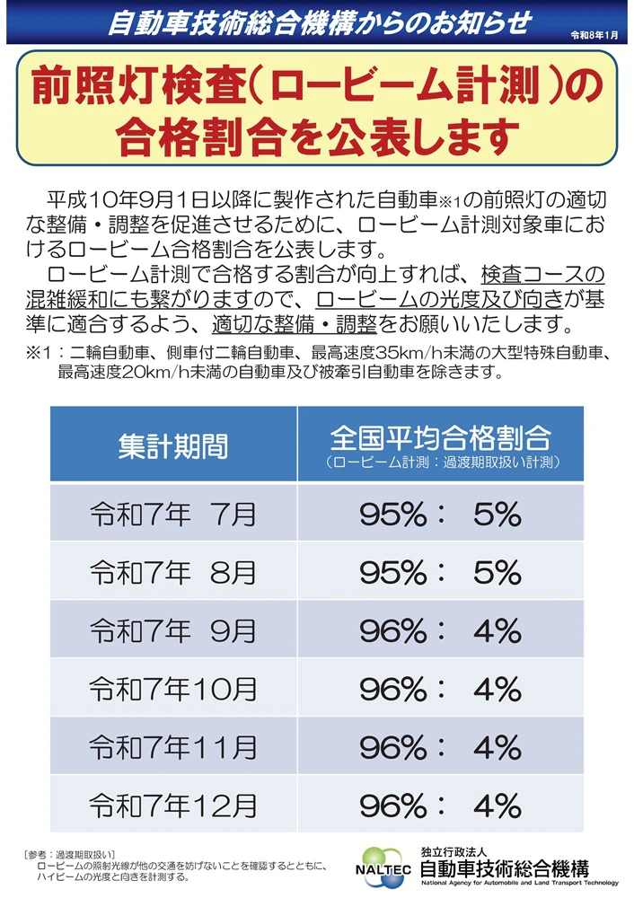 自動車技術総合機構(NALTEC)が公表した最新データによれば、令和7年12月時点でのロービーム計測の全国平均合格率は96%に達している 。数字だけを見れば「概ね良好」と映るかもしれないが、この裏側には、現行の交通法規との乖離や、検査を諦め廃車に至った旧型車ユーザーがどれほど存在したのかまでは触れられていない。