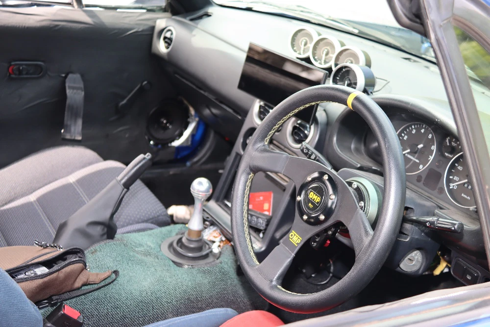 かみむら: お気に入りは、やっぱりエンジンフードを開けたときのこのエンジンルームですね。きらびやかで目立ちますし。心臓部はNBロードスターの1.8リッター可変バルブタイミング機構付きエンジンに載せ替えてあります。