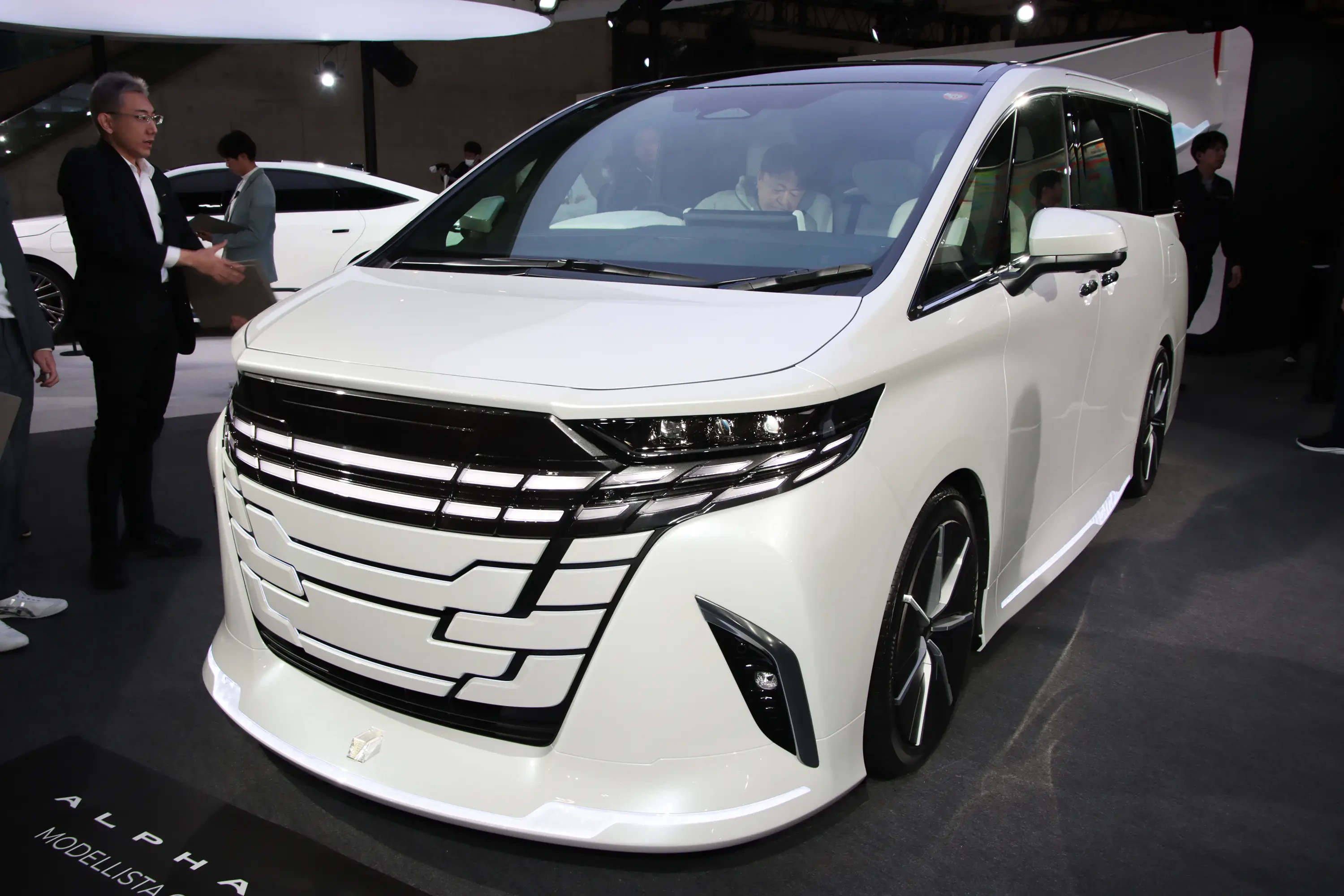 現行トヨタ・アルファードをベースとした「アルファードモデリスタコンセプト」は、ドレスの裾をイメージしたエアロパーツや、間接照明を用いた加飾に加え、インテリアに石目パネルを装着するなど、より踏み込んだ表現がなされている。