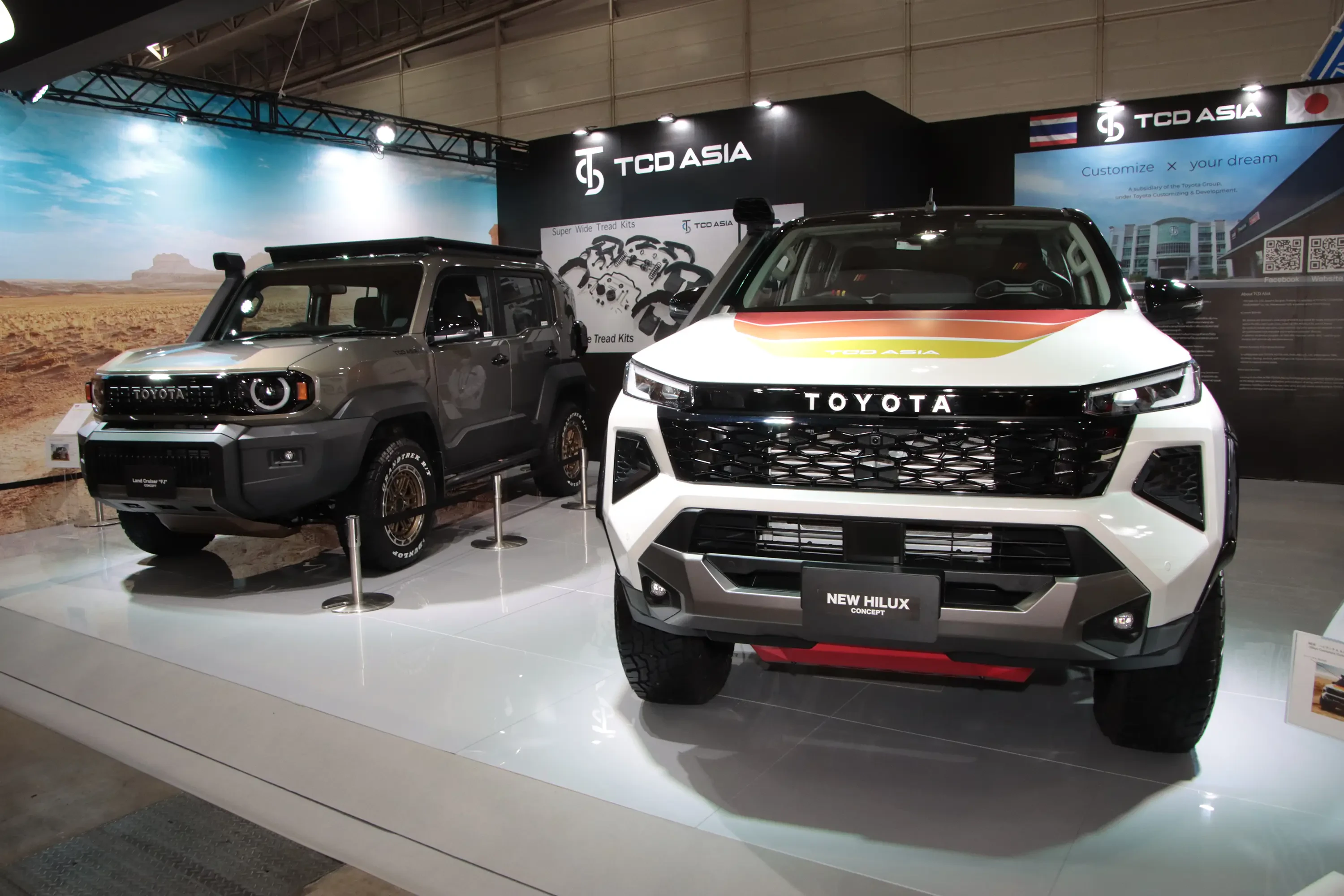 TCDのアジア・中東担当子会社、TCDアジアは、それぞれ日本では2026年年央に発売予定のピックアップトラック「トヨタ・ハイラックス」と、ミッドサイズオフローダー「ランドクルーザー“FJ”」をベースに、同社が開発した純正アクセサリーのプロトタイプを装着した「カスタマイズコンセプト」を出品。