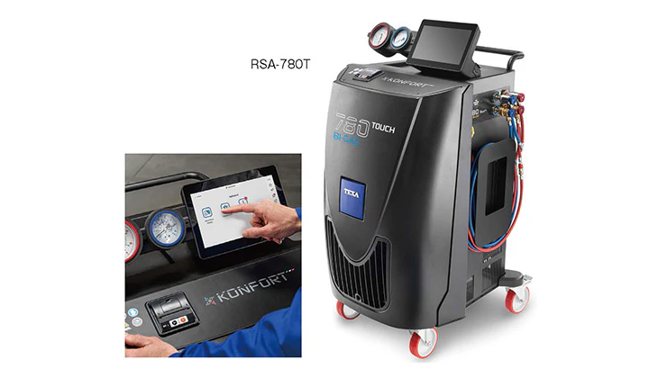 大型液晶タッチパネルに作業手順を一覧表示し、直感的な操作を実現した全自動フロンガス交換機。エアコンラインの自動診断からガス回収.充填まで行うモードと、工程別に詳細設定ができる単独モードを搭載。無線LAN対応により、社内プリンターでの出力やソフトの自動更新もスムーズ。新旧ガスそれぞれの専用機はスタンダードモデルとエントリーモデルの2タイプから選択可能で、新旧両対応の「RSA-780T」も用意。これら5機種は本年1月に「中小企業省力化投資補助金」の対象となり、最大1/2の補助を受けて導入できる。
