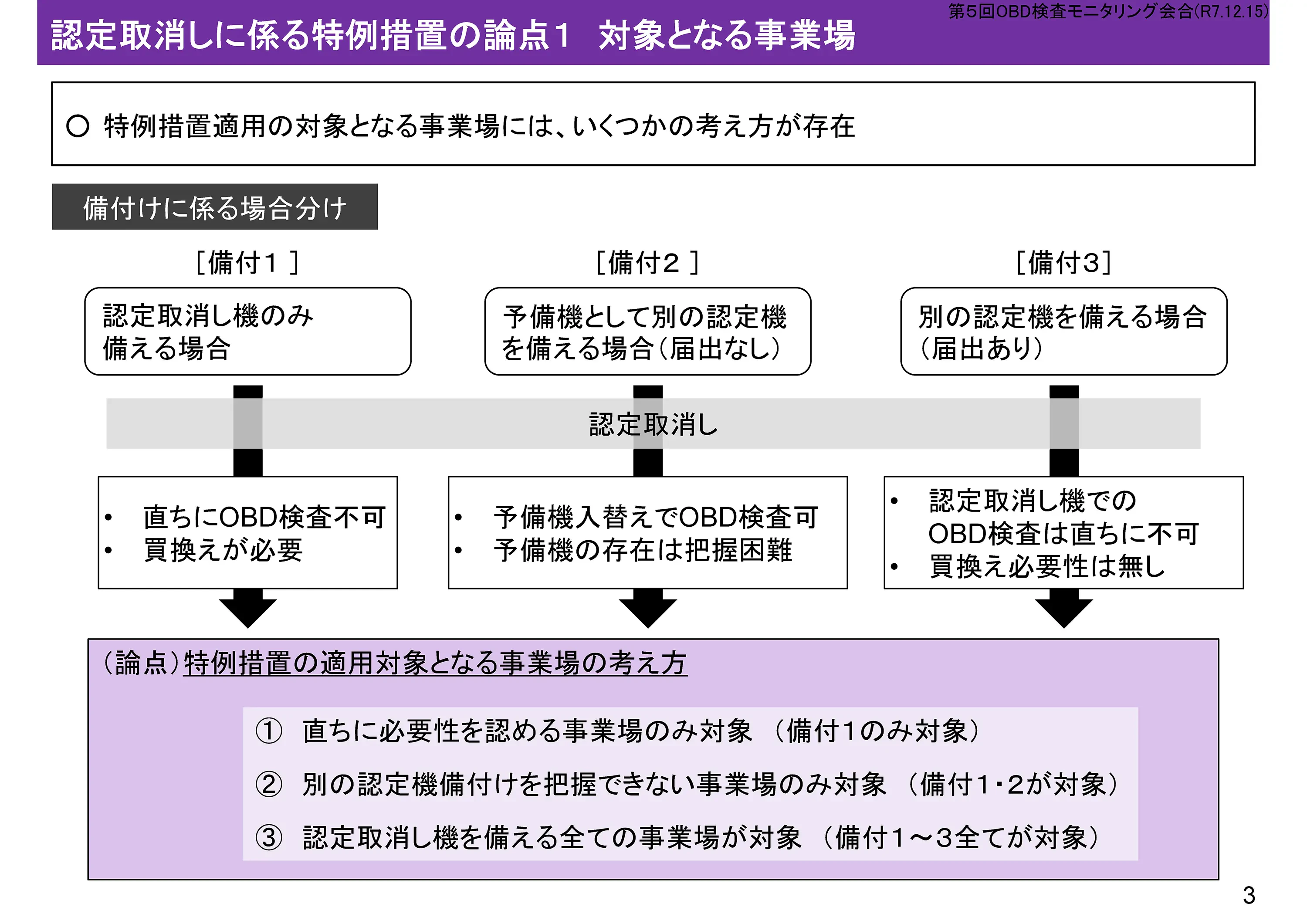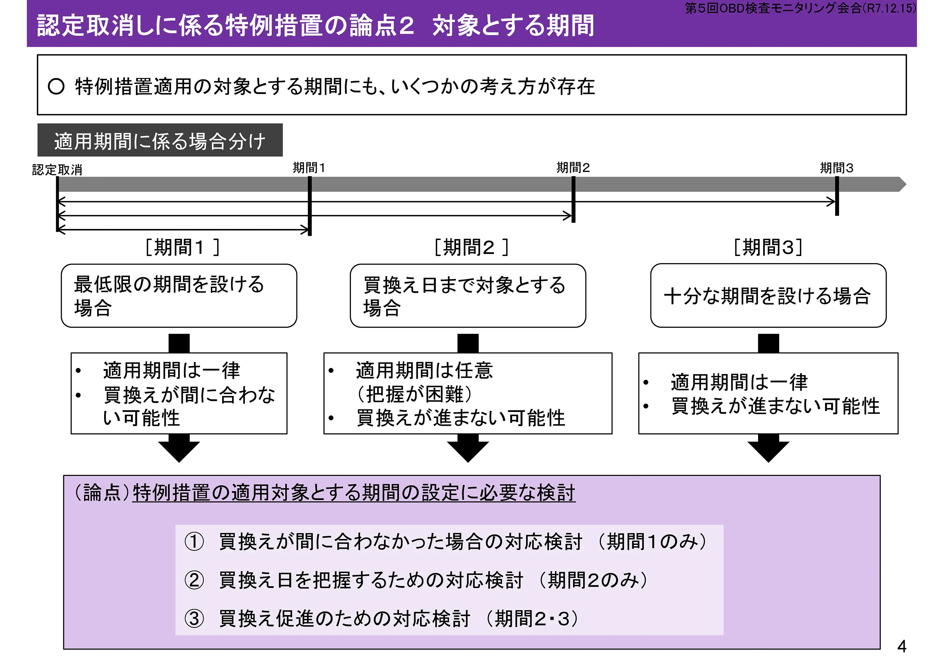 さらに、検査用スキャンツールが認定取り消しとなった場合に特例措置適用の対象となる事業場と期間について議論。それぞれ3つのパターンが例示された。