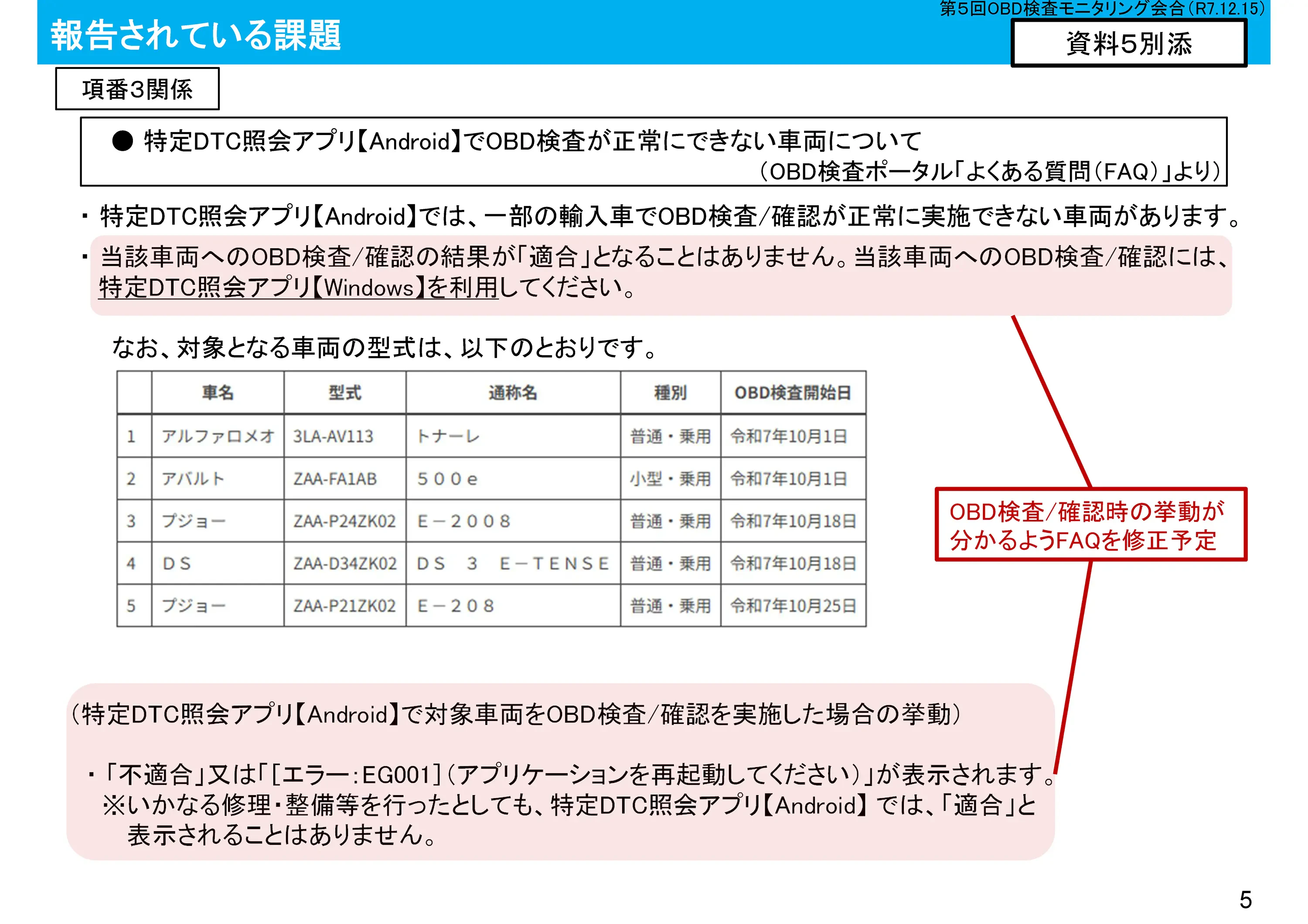 今回の第5回会合では、2024年10月1日より開始されたOBD検査において、2025年8月20日から同年11月24日までに関係者を通じて得られた課題についても確認。