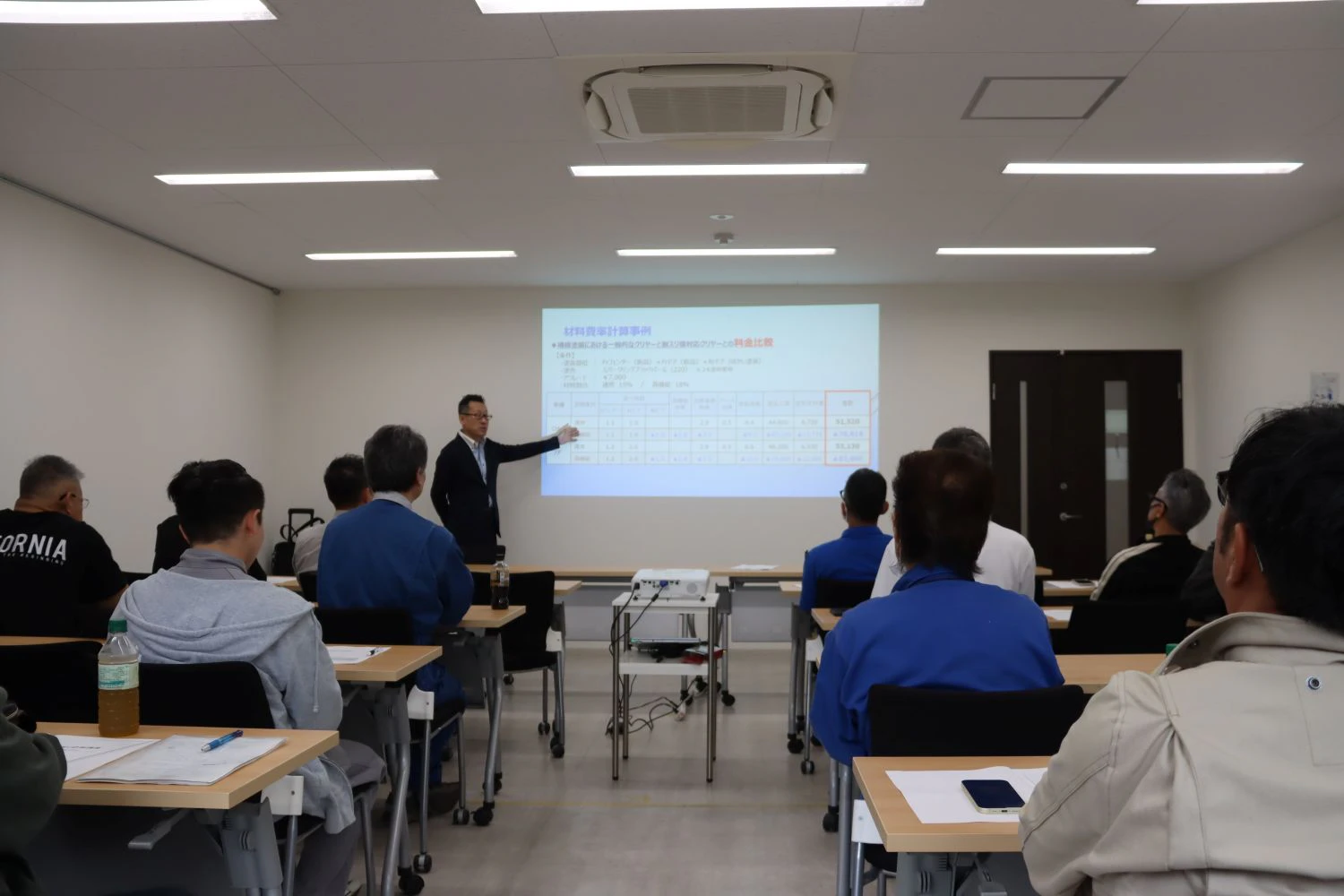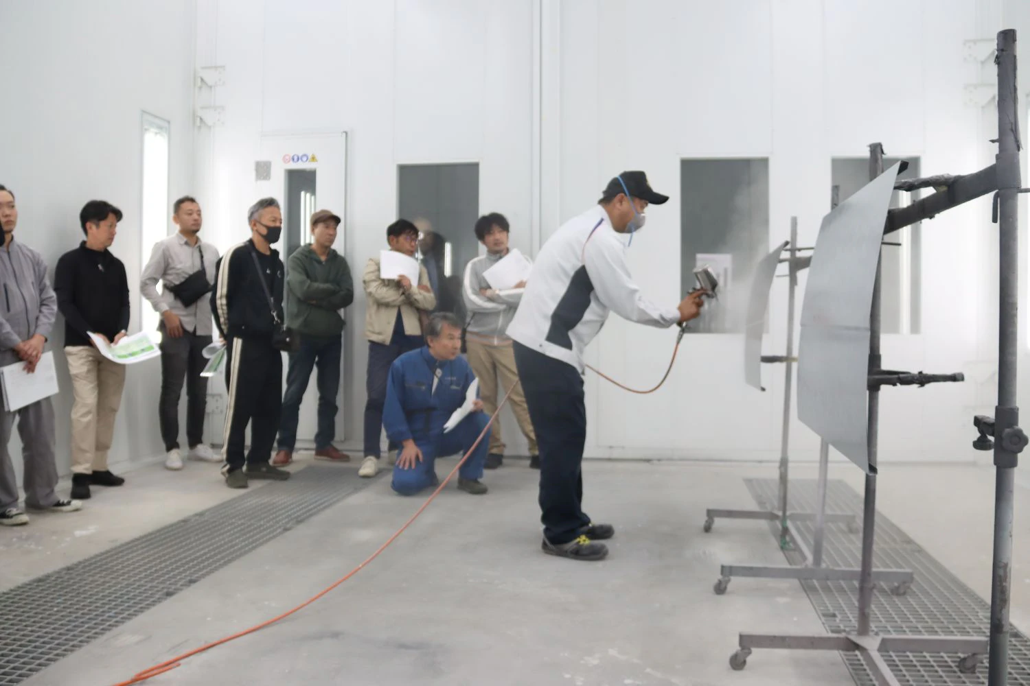 午前の座学では、補修塗装における一般クリヤーと耐スリ傷性クリヤーを比較した材料費率計算例の見積り時の注意点などを紹介。比率については、自社独自で設定する場合、根拠ある数値を準備する必要性を訴求した。その他、複数パネル塗装時やブース加算時の計上漏れしやすい項目といった補修塗装指数への現場での対策方法を説明した。