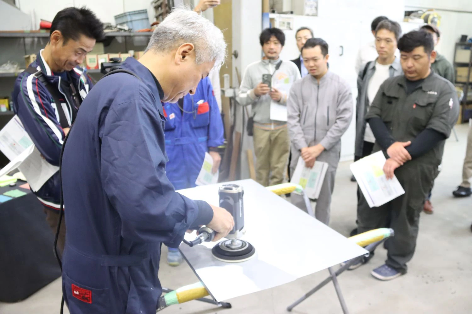 午後は、通常クリヤーと高機能クリヤーについて、トヨタ1F7・202を例に淡色と濃色の研磨傷の見え方の差を比較しながら実演。バフの当て方やペーパーの目合わせ、水拭きといった基本作業の要点から、高機能クリヤーを磨く際のポリッシャーの動線や複数個所のペーパー傷を磨き切る際の考え方などを紹介した。