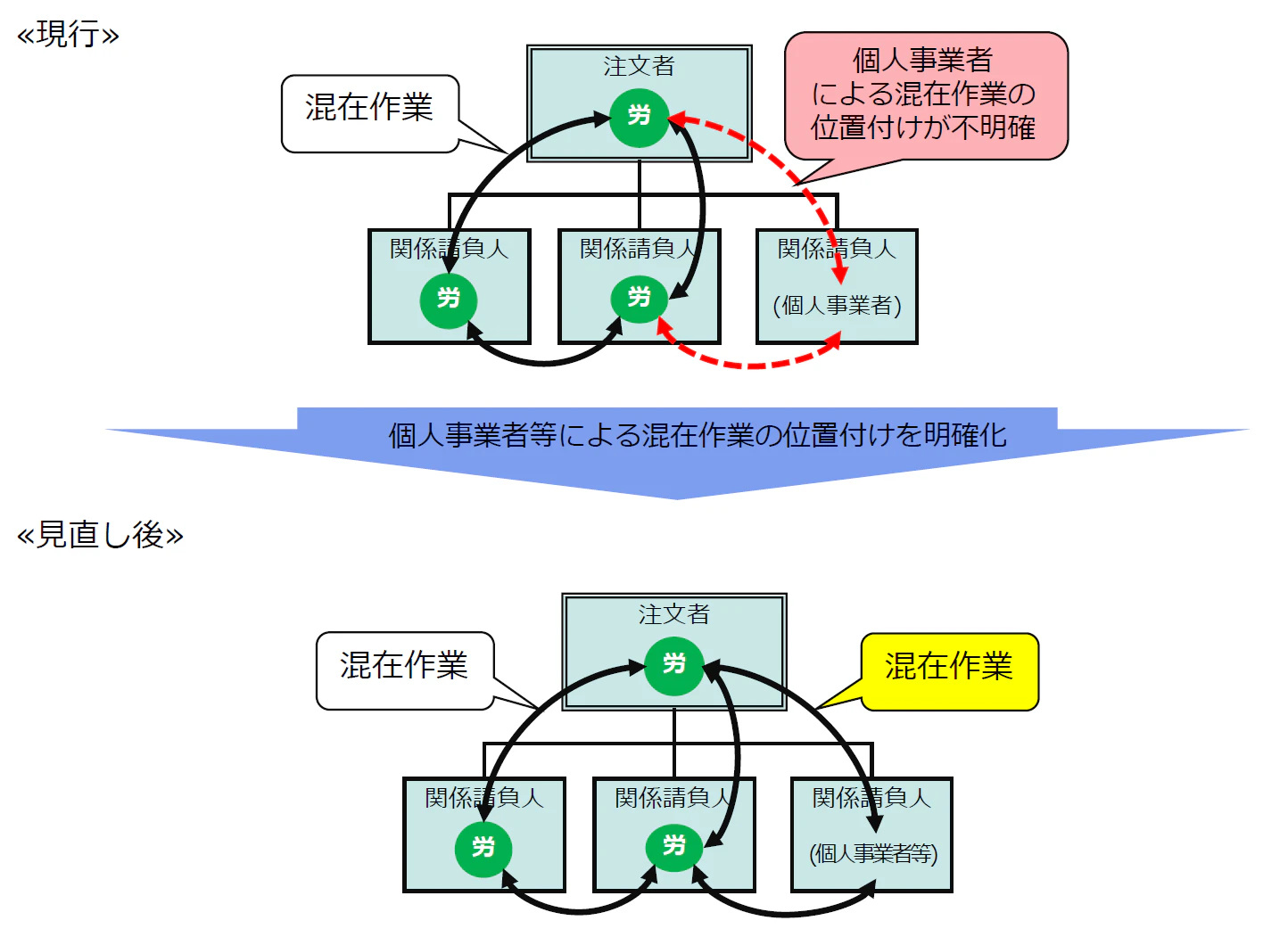 従業員と同じ場所で働く個人事業者等(一人親方やフリーランス)が、法的な保護対象及び義務の主体として明確に位置付けられた。これにより、自社工場内で作業を委託している外注の技術者と混在して作業を行う場合、注文者(経営側)による作業間の「連絡調整」などの安全措置が義務化された。経営者や工場長は「特定の有害物質を使っていない」、「外注の技術者は自社の労働者ではないから関係ない」という認識を持っているのであれば改め、現場全体を俯瞰した安全管理体制の構築が迫られている。