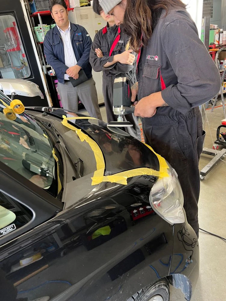 黒色のボンネットにダブルアクションサンダーで1500、2500番のペーパーをかけた後、シングルポリッシャーとBAY-PAD115・BAY-FIBER130・BAY-1コンパウンドの組み合わせによる最短時間でのペーパー目消しを実演。回転速度や圧力の加減で塗り肌を落とす、残すのコントロール方法や、BAY-BLACK150、BAY-2コンパウンドによる高品質な仕上げ方を学んだ。協賛はベイスリー。講師はベイスリー・三浦氏。参加者は7人。