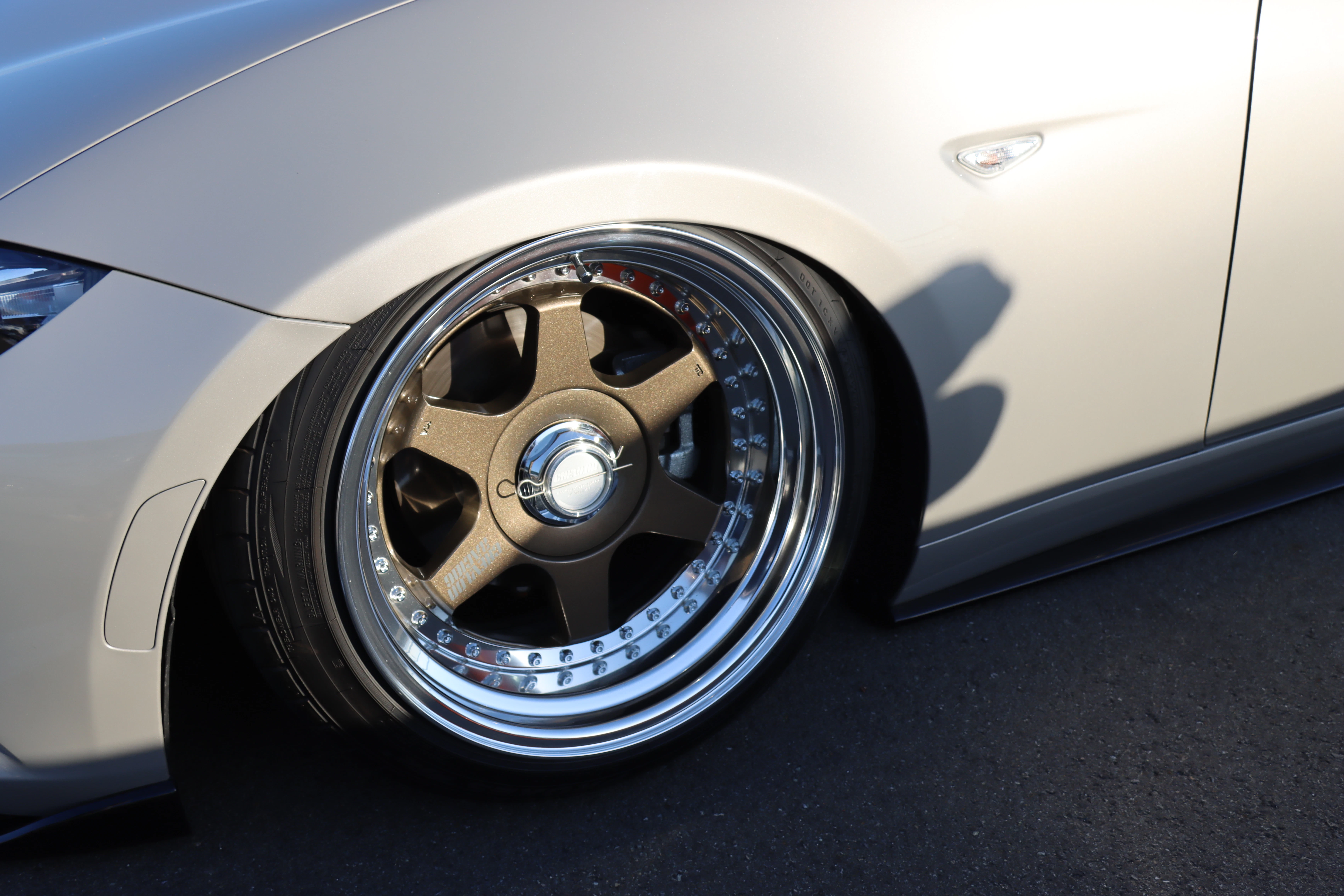 特にこだわったのは、足回りです。フェンダーとタイヤの面をぴったり合わせる「ツライチ」をとことん追求し、フェンダーの上にタイヤが乗るくらい、本当にぎりぎりまでセッティングを詰めています。