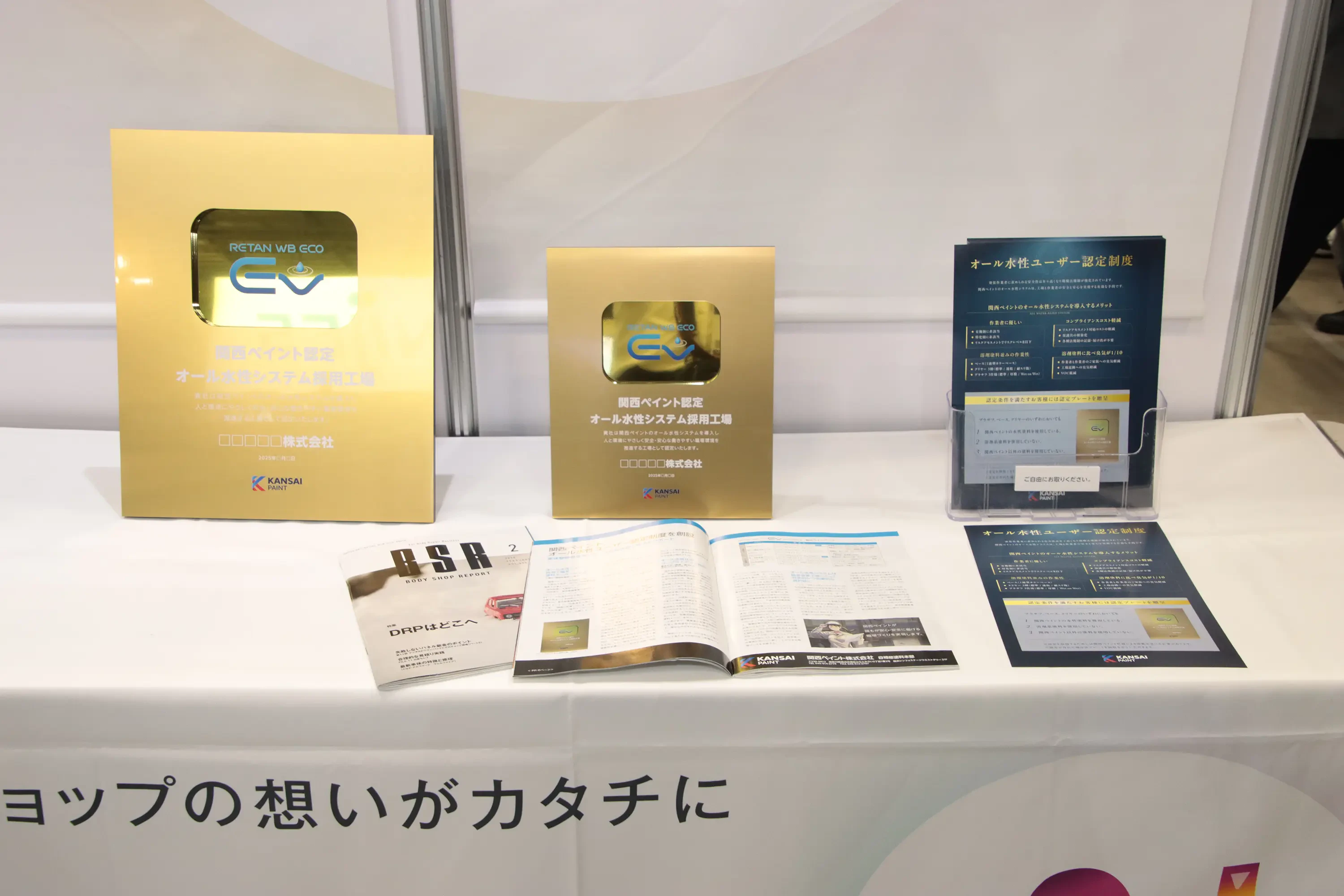 有機溶剤中毒予防規則や特定化学物質障害予防規則などに非該当の自動車補修用塗料製品群「オール水性 有機則フリーシステム レタンWBエコEVシステム」ユーザーを対象とした「オール水性ユーザー認定制度」の認定プレートを展示。