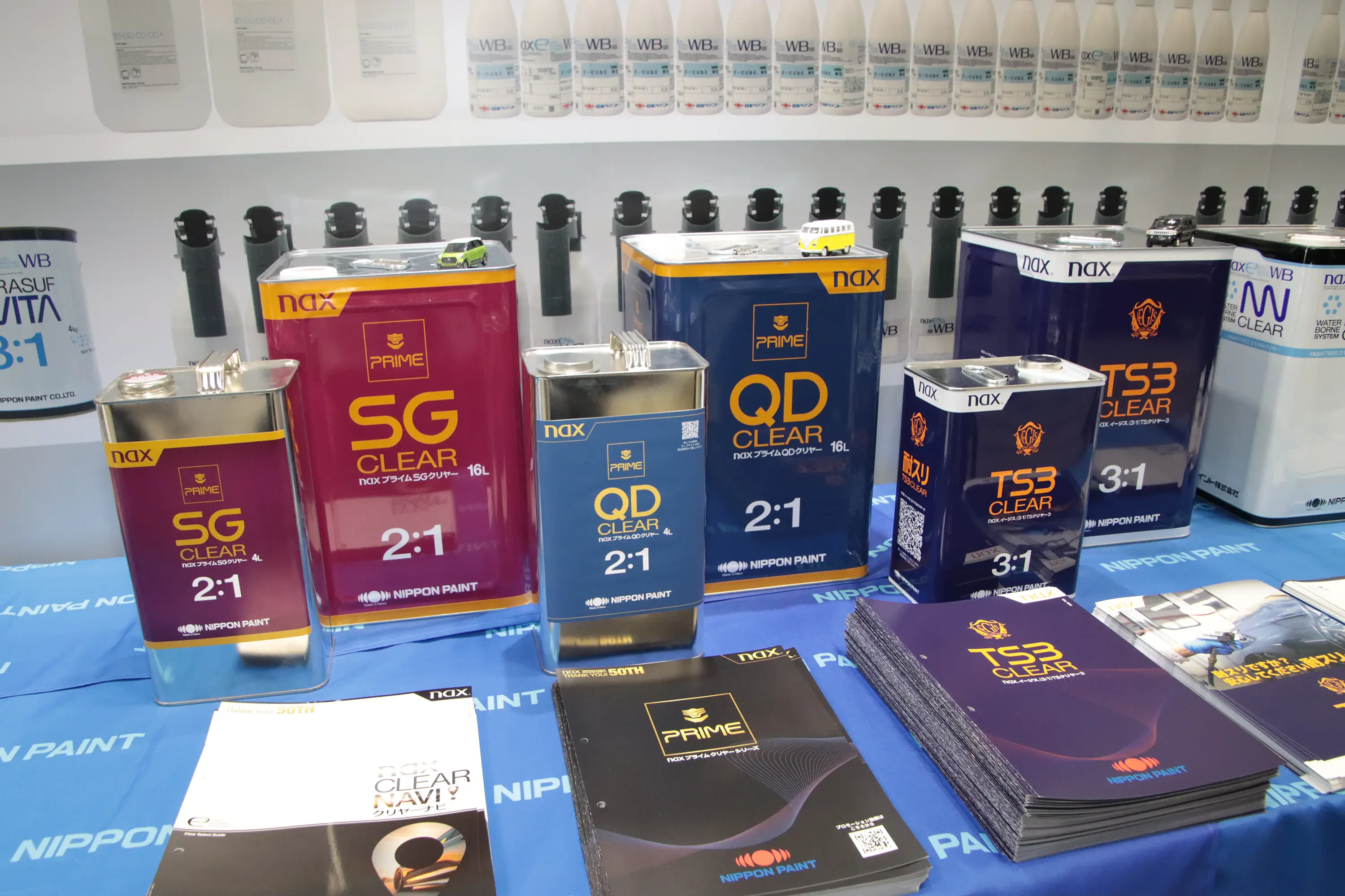 「プラサフVITA」「水性ベースコート」「(2:1)NNクリヤー」で構成される「nax E-CUBE WB水性システム」を訴求しつつ、トヨタの耐スリ傷性クリヤー「セルフリストアリングコート」に対応する「naxイージス(3:1)TSクリヤー3」(写真右)などを出品した。