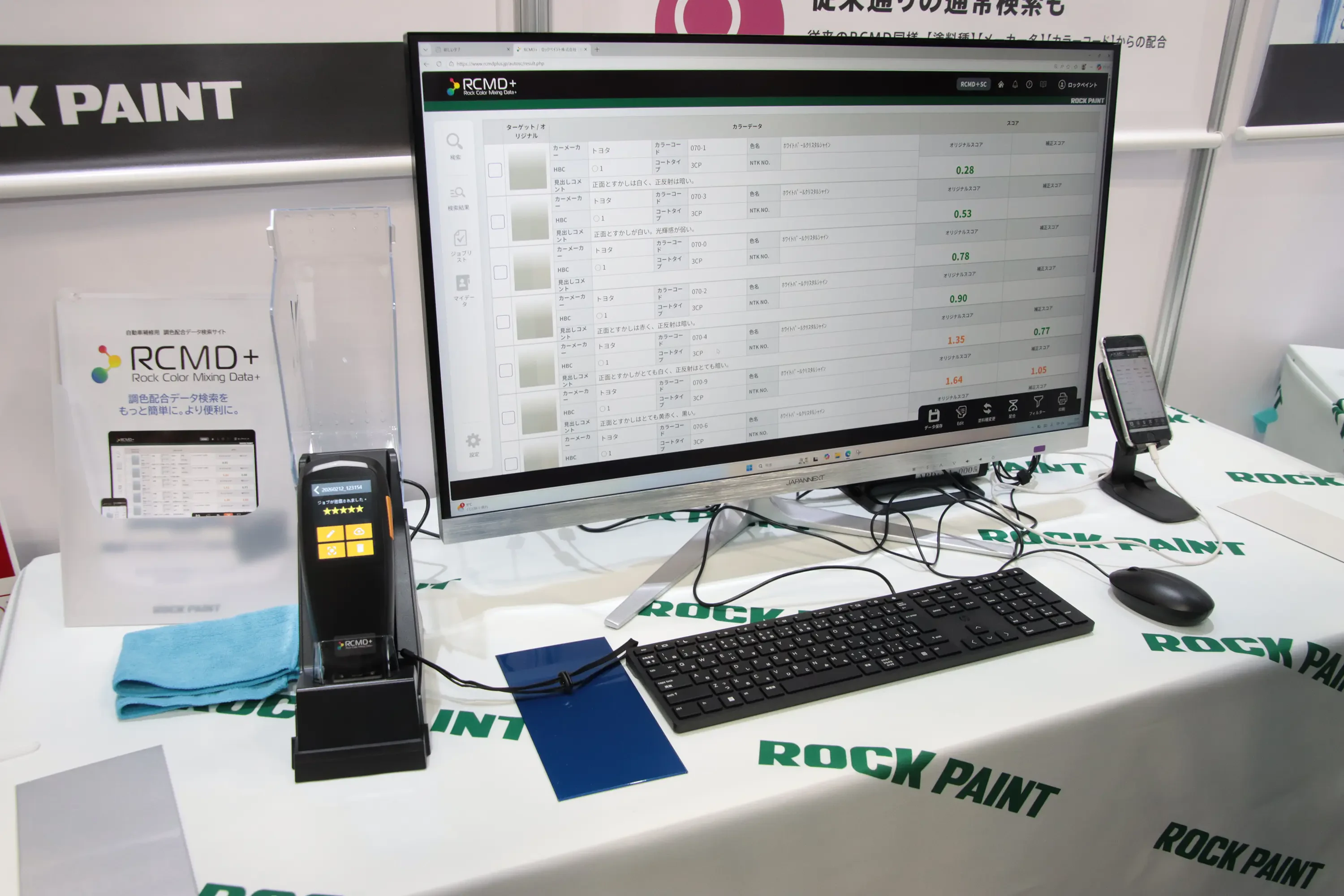 1液水性ベースコート「ネオウォーターベース」を核とする「ロックオール水性化塗装システム」を訴求。また、自動車補修用塗料調色配合データ検索サイト「RCMD」の全面リニューアル版「RCMD+」を初めて公開した。