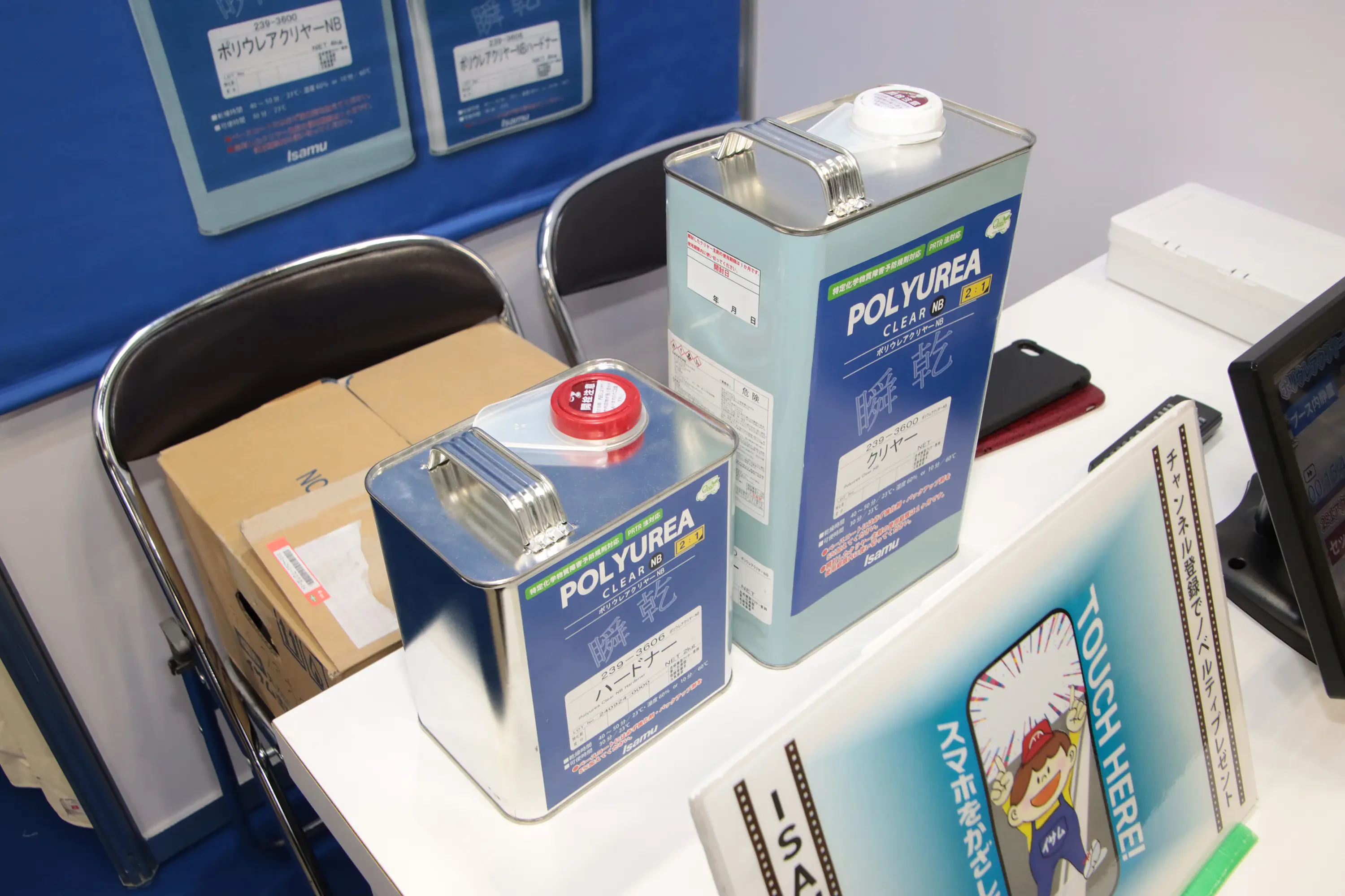 1液水性ベースコート「クロノスHD」「アクアスドライ」のほか、強制乾燥不要の2液型クリヤー「ポリウレアクリヤーNB」(写真)を出品。環境負荷低減と作業効率向上を両立できることを訴求した。