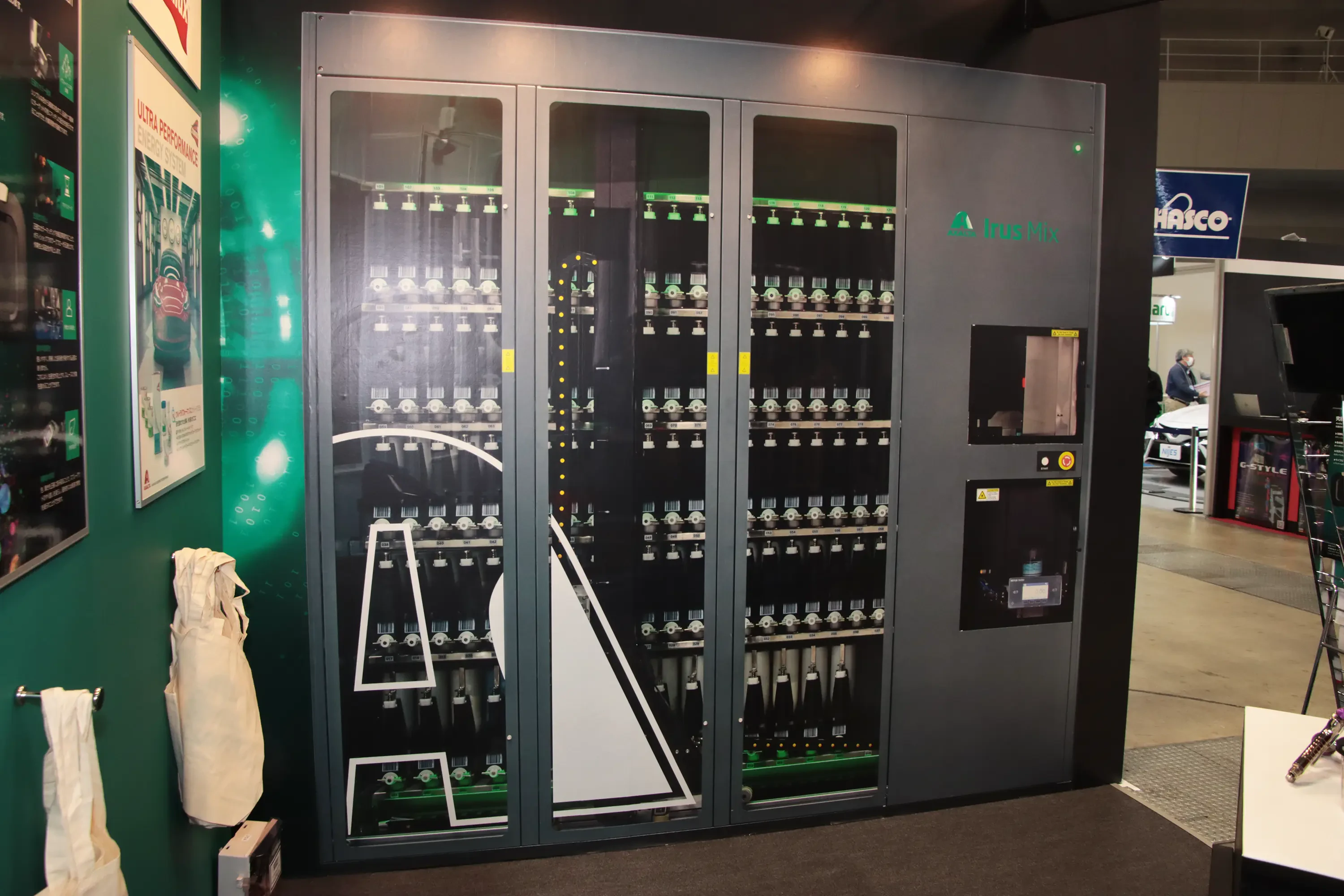 昨2025年に日本へ導入した測色機「アイラス・スキャン」を出品。また全自動調合機「アイラス・ミックス」をパネル展示(写真)し、熟練の技術者でなくとも適切な測色・調合が短時間で可能となることをアピールした。