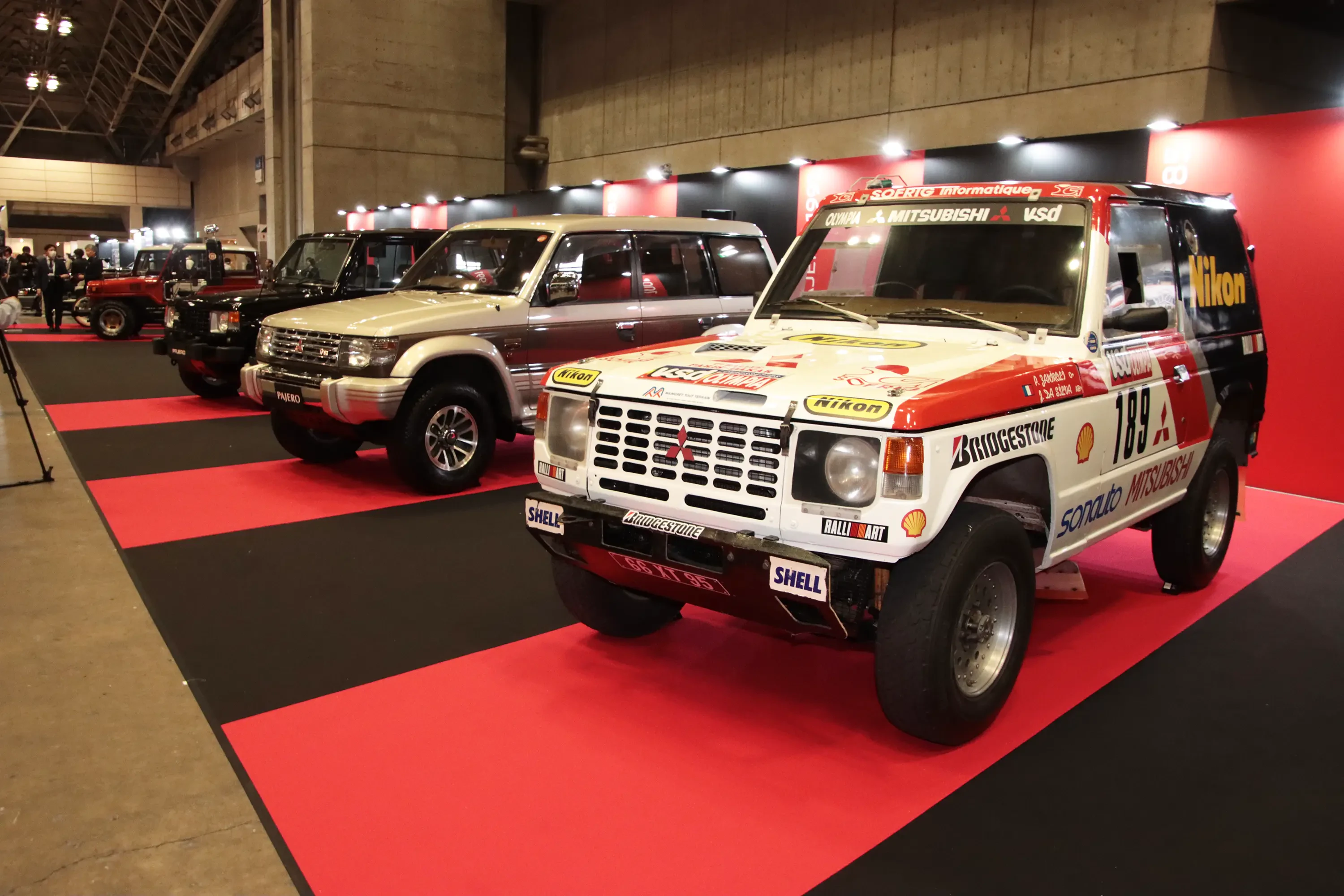 (手前より)初代三菱パジェロのダカールラリー参戦車両、2代目三菱パジェロ、初代三菱パジェロ