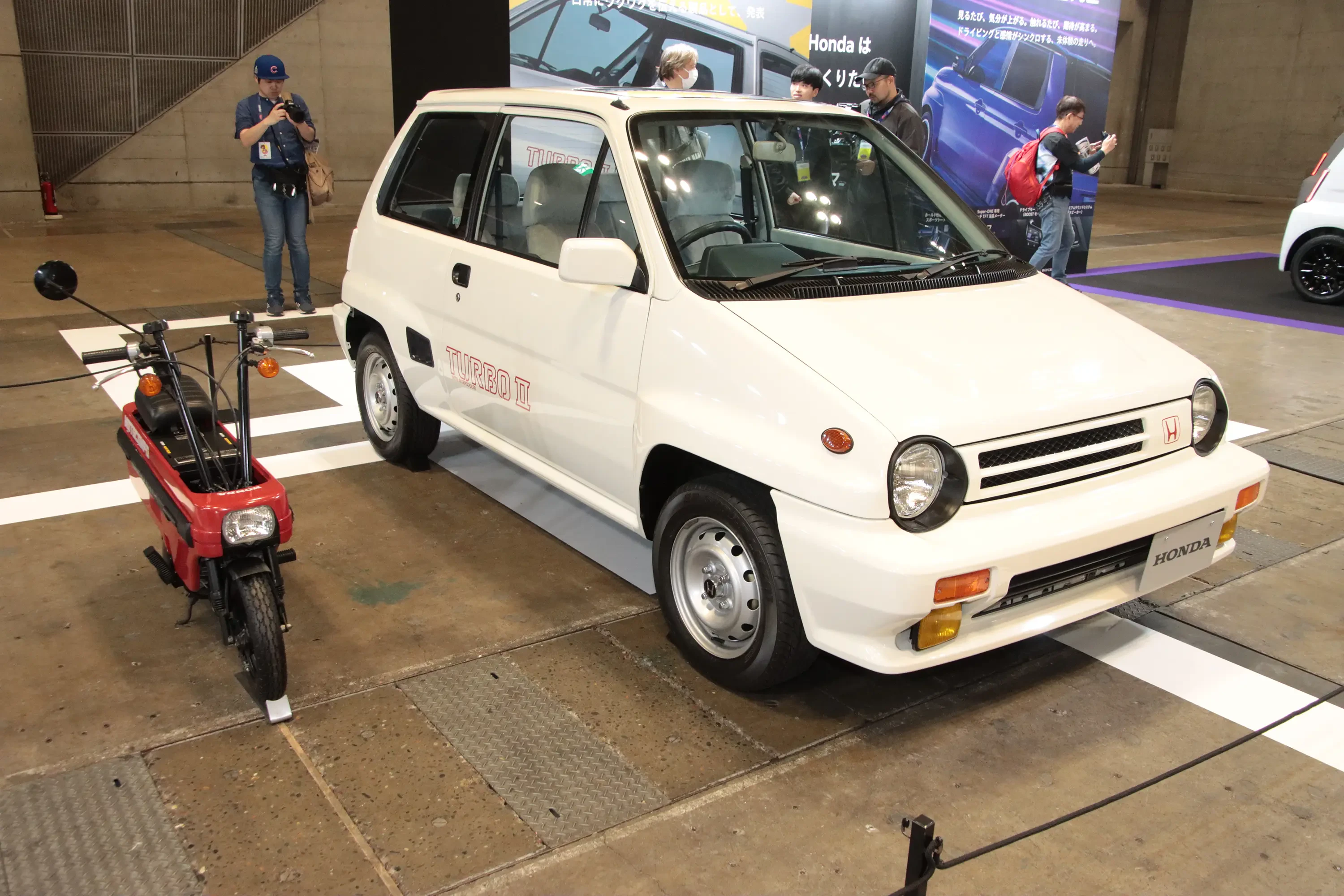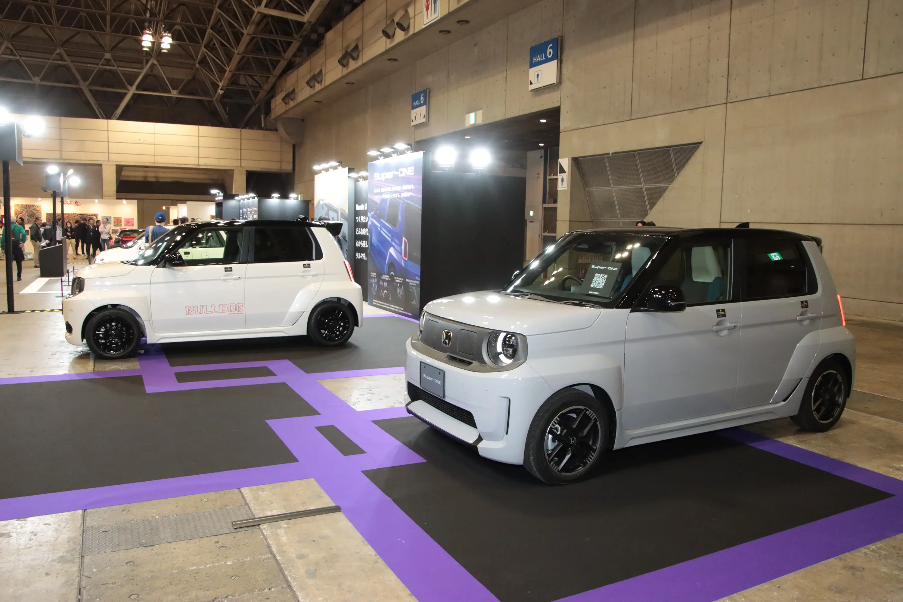 2026年5月下旬発売予定の小型ホットハッチBEV「スーパーワン」と、同車のルーツとされ「ブルドッグ」の愛称をもつ初代「シティターボ2」、そのスタイルを「スーパーワン」の純正アクセサリーで再現したエクステリアコーディネート「ブルドッグスタイル」を同時に展示。