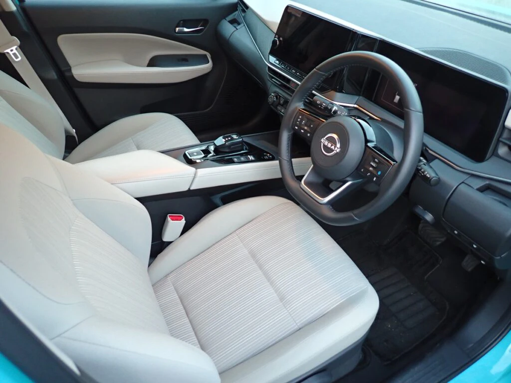 日産本社の地下駐車場で対面した、鮮やかなターコイズブルーに塗られたノートのドアを開けた瞬間、とても嬉しい気持ちになった。なぜならばそこには薄いベージュに彩られたファブリックのシートと明るいインテリアがあったからで、もうこれだけで自動車の印象がぜんぜんちがう。馬鹿の一つ覚えみたいに、本革シートばかり礼賛している自動車メーカーの風潮には辟易しているので、こういうファブリックのふんわりしたノートのシートに座れただけでとにかく嬉しい。